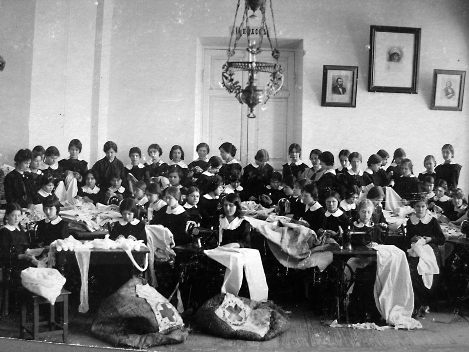 Ученицы Ардатовской женской гимназии за шитьем белья для «Красного креста». Автор: С. Тимин Место события: Ардатов Дата: 1915 г.