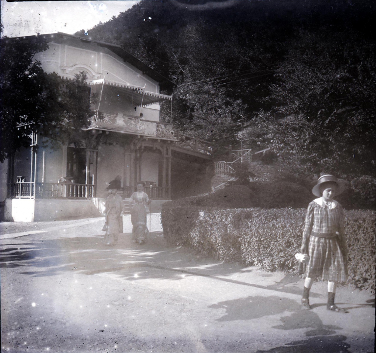 Наталия Павловна Дурдина с матерью и неизвестными женщинами у лестницы перед домом