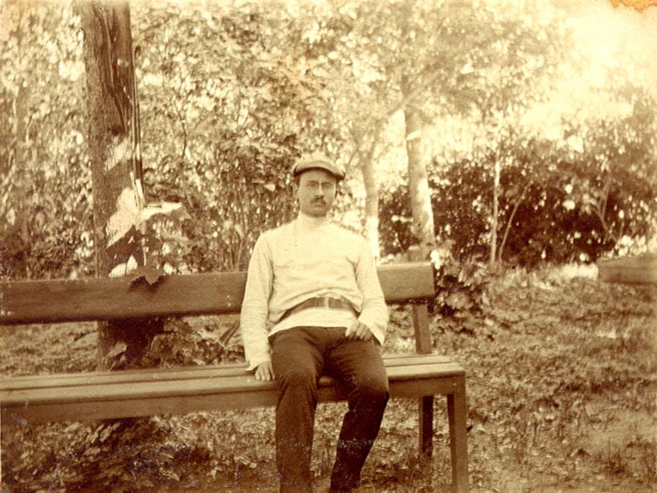 Владимир Масленников на скамейке в саду.