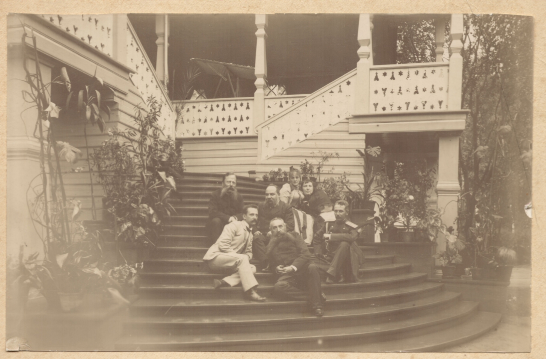 Наталия Павловна Дурдина с матерью и неизвестными женщинами у лестницы перед домом