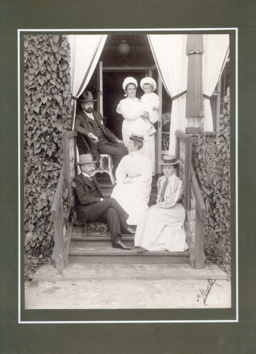Наталия Павловна Дурдина с матерью и неизвестными женщинами у лестницы перед домом