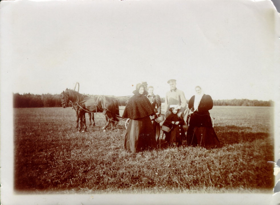 Наталия Павловна Дурдина с матерью и неизвестными женщинами у лестницы перед домом