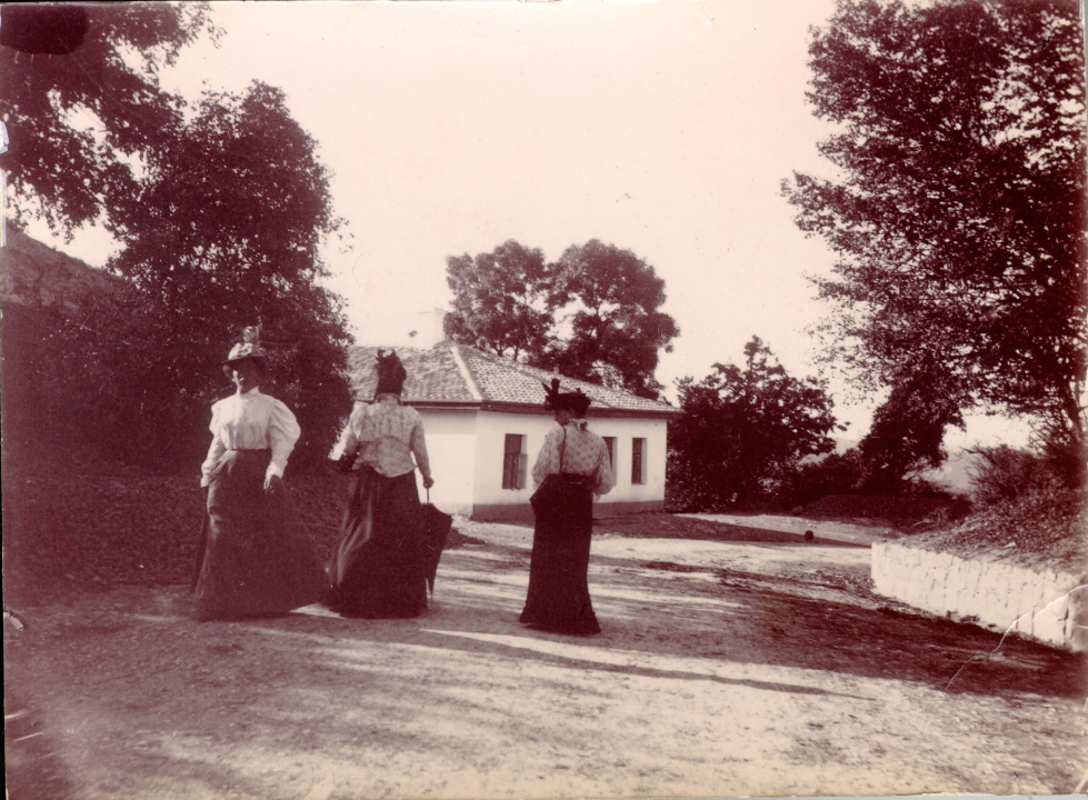 Наталия Павловна Дурдина с матерью и неизвестными женщинами у лестницы перед домом