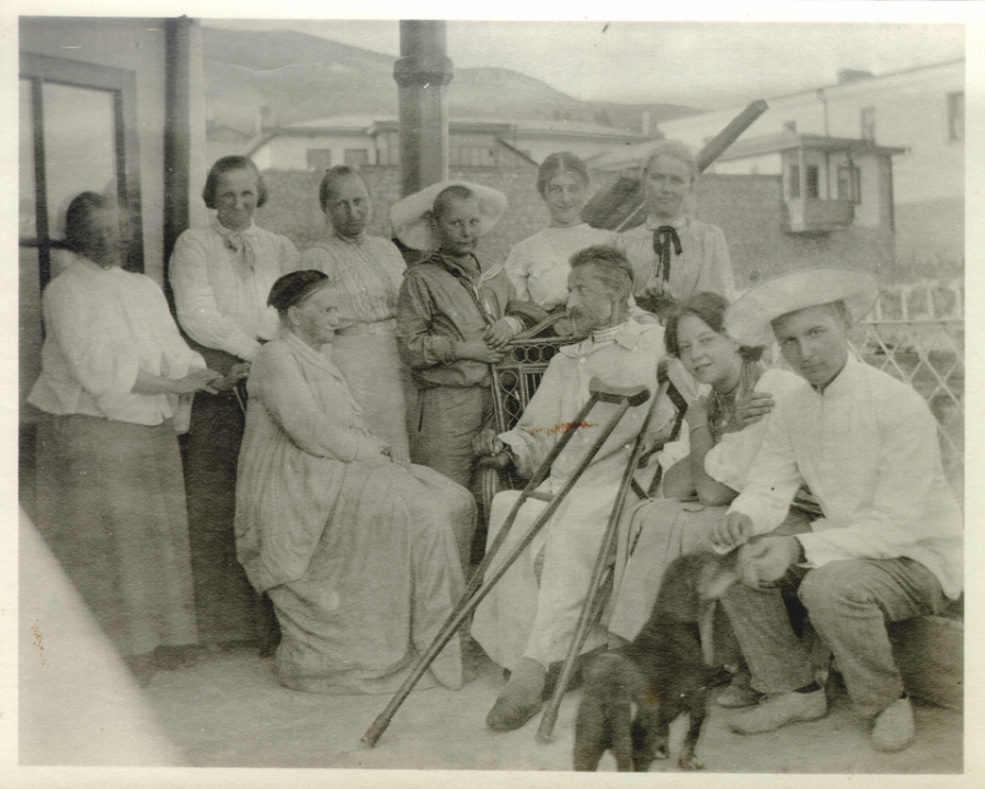 Наталия Павловна Дурдина с матерью и неизвестными женщинами у лестницы перед домом