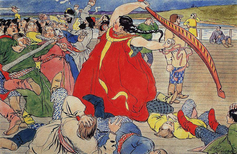 Девушка-чернавушка побивает мужиков новгородских (Эскиз иллюстрации к былине о Василии Буслаеве для журнала «Шут»)
