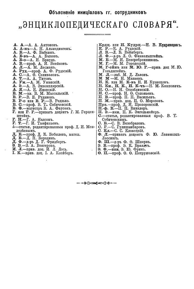 Самая крупная дореволюционная русская универсальная энциклопедия, выпущенная акционерным издательским обществом «Ф. А. Брокгауз — И. А. Ефрон». Состоит из 86 томов (82 основных и 4 дополнительных), выходивших в течение 1890-1907 годов. Первые 8 томов (до буквы «В») вышли под общей редакцией профессора И. Е. Андреевского и в основном содержали переводы на русский язык статей знаменитой немецкой энциклопедии Брокгауза «Konversations Lexikon».