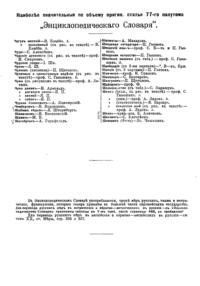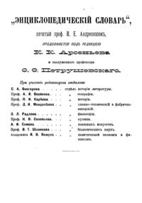 Самая крупная дореволюционная русская универсальная энциклопедия, выпущенная акционерным издательским обществом «Ф. А. Брокгауз — И. А. Ефрон». Состоит из 86 томов (82 основных и 4 дополнительных), выходивших в течение 1890-1907 годов. Первые 8 томов (до буквы «В») вышли под общей редакцией профессора И. Е. Андреевского и в основном содержали переводы на русский язык статей знаменитой немецкой энциклопедии Брокгауза «Konversations Lexikon».