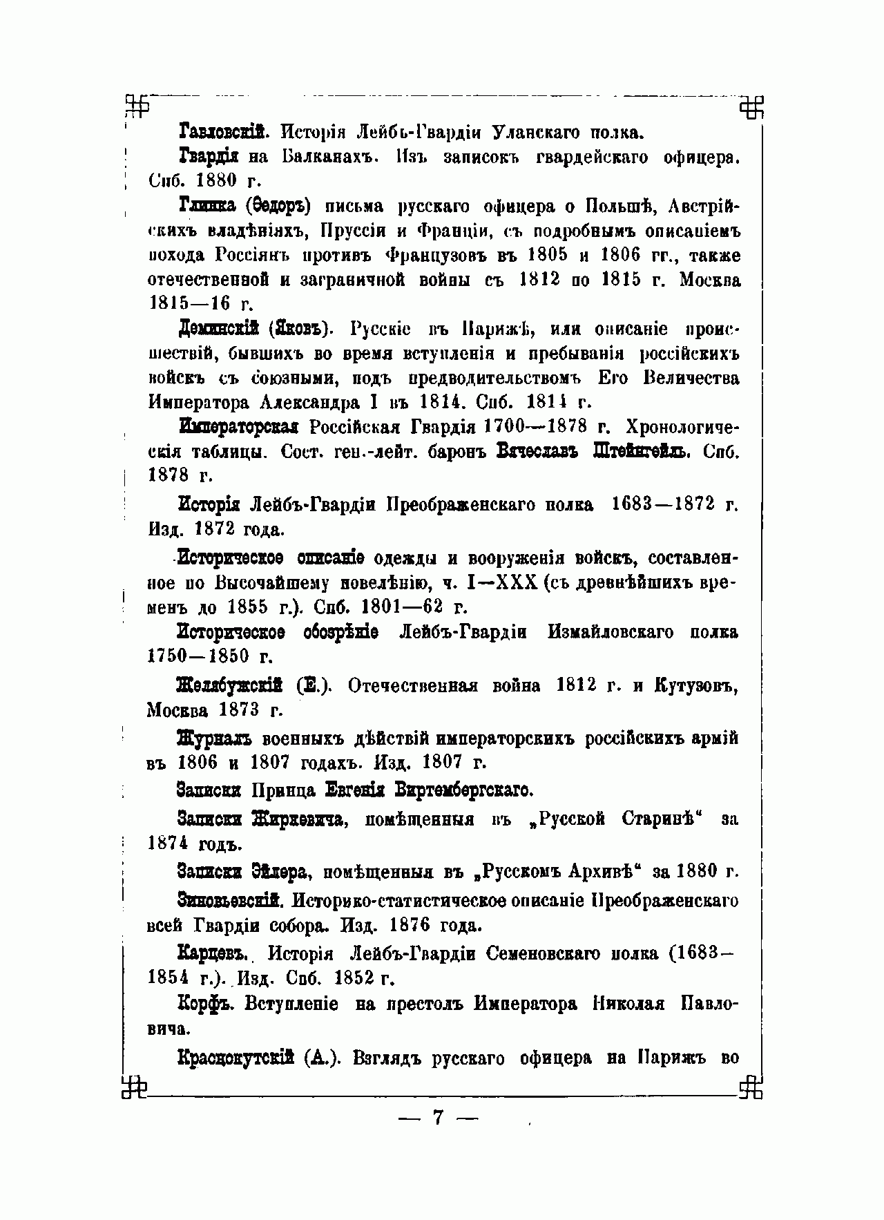 Начало лейб-гвардии Преображенскому полку, а вместе с тем русскому регулярному войску и гвардии положил император Петр Великий. Полк был сформирован в 1691 г. из жителей потешного села Преображенского, от которого и получил свое название. В 1700 г. полк получил имя лейб-гвардии Преображенского полка. Один из самых аристократических полков российской армии. В трех томах содержится подробная история полка. Повествование охватывает период 1683–1883 гг.