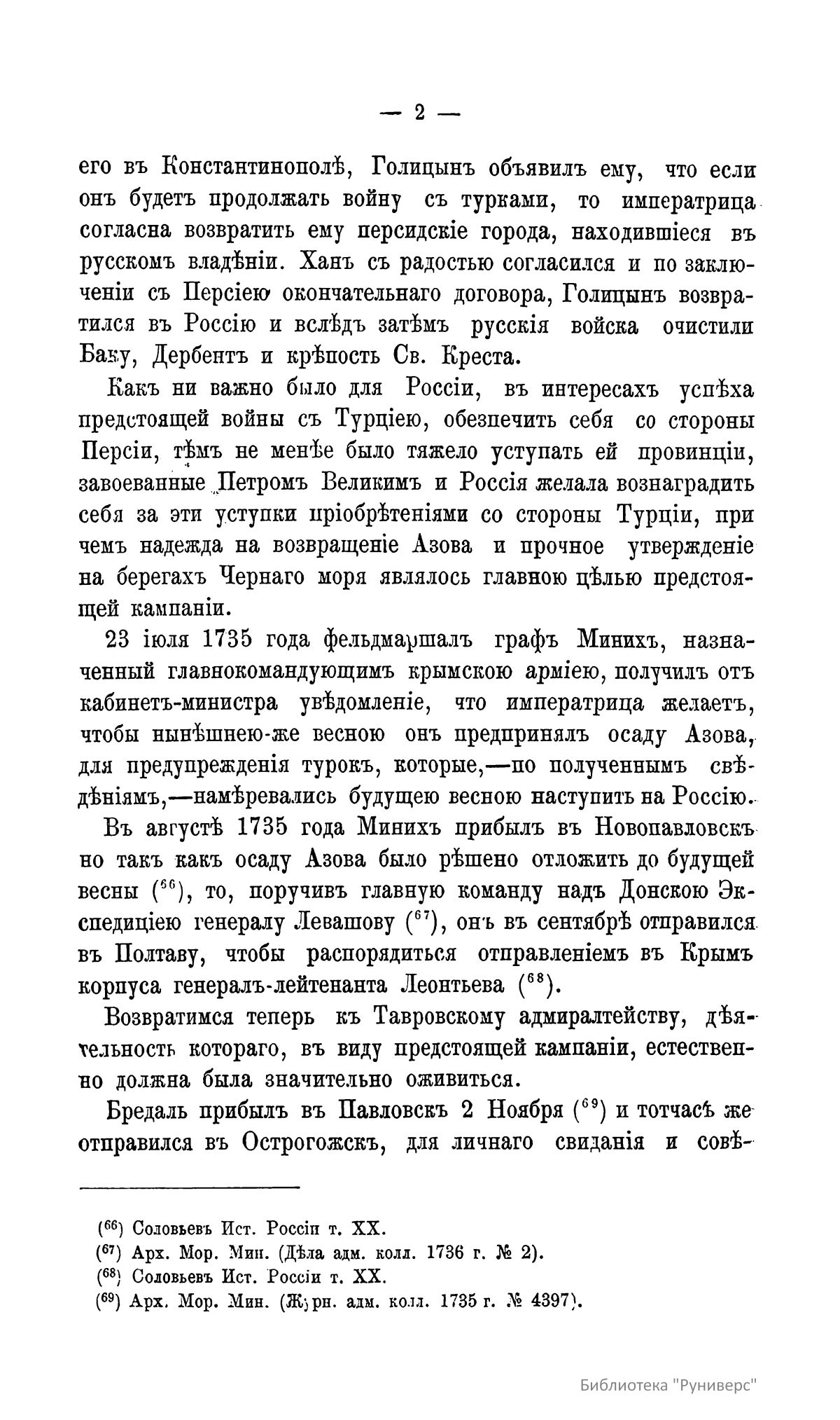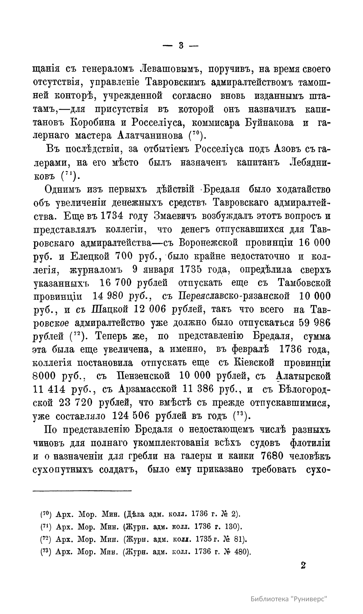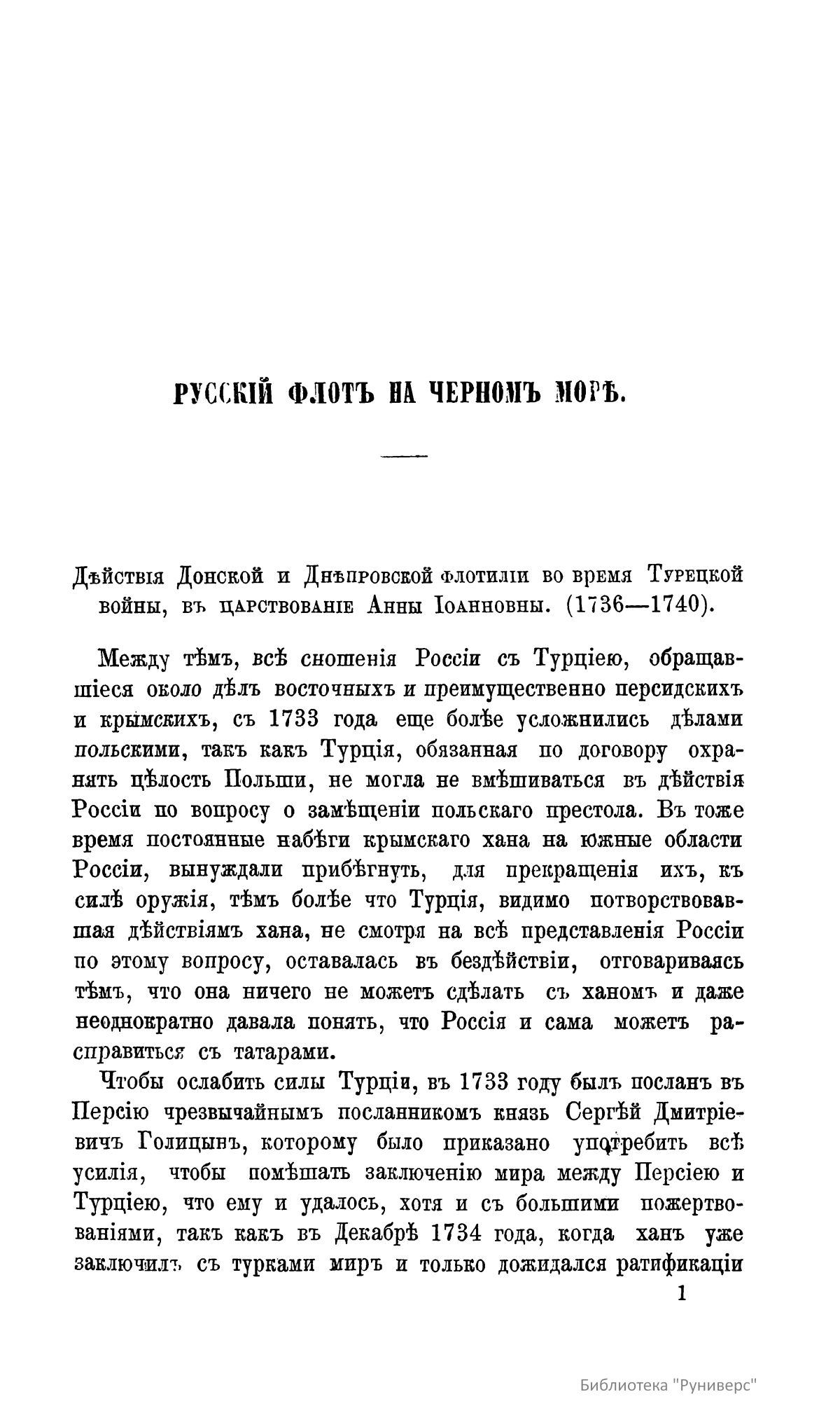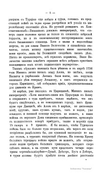 В издании подробно описывающей действия Донской и Днепровской флотилий во время Русско-турецкой войны 1736–1740 годов в правление императрицы Анны Иоанновны. В тексте объясняются сложные внешнеполитические причины начала конфликта, включая польский и крымский вопросы, а также дипломатические усилия по заключению союза с Персией для ослабления Турции. Значительная часть материала посвящена осаде Азова в 1736 году под командованием фельдмаршалов Миниха и Ласси, включая логистику и непосредственное участие флотилии под руководством Бредаля. Также детально излагаются трудности, связанные с строительством и переброской Днепровской флотилии для кампании 1737 года, направленной на взятие Очакова, с указанием проблем с транспортировкой судов через днепровские пороги и последующих претензий к их конструкции.