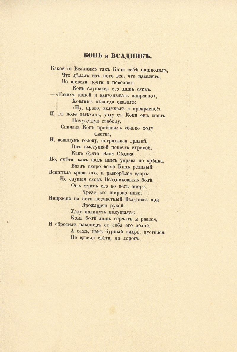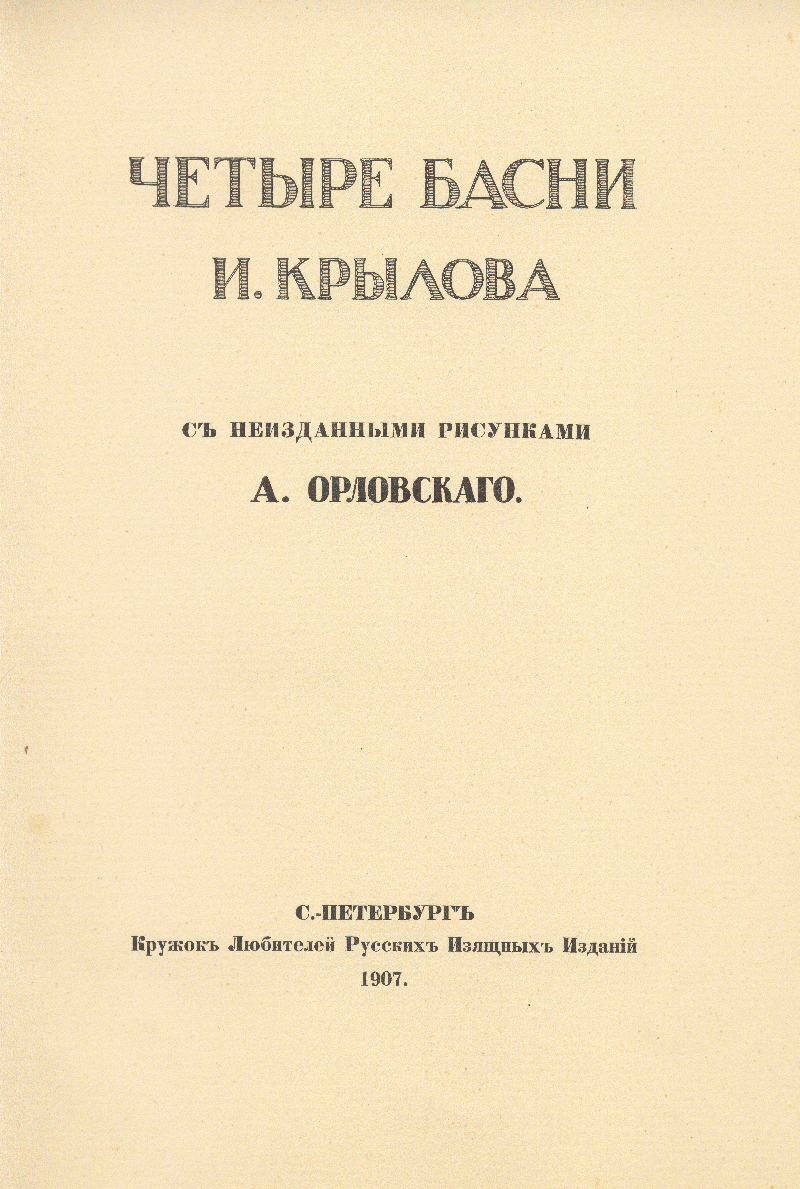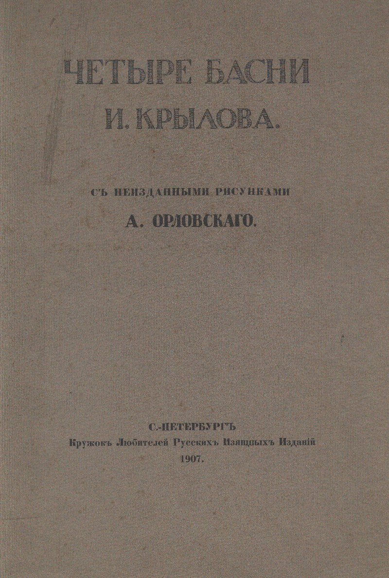 В это издание вошли четыре басни Ивана Андреевича Крылова: «Конь и всадник», «Квартет», «Собачья дружба» и «Демьянова уха», каждая из которых иллюстрирована не издававшимися ранее рисунками художника начала XIX века Александра Орловского. Издание отпечатано типографией Р. Голике и А. Вильборг на плотной бумаге верже желтоватого цвета.