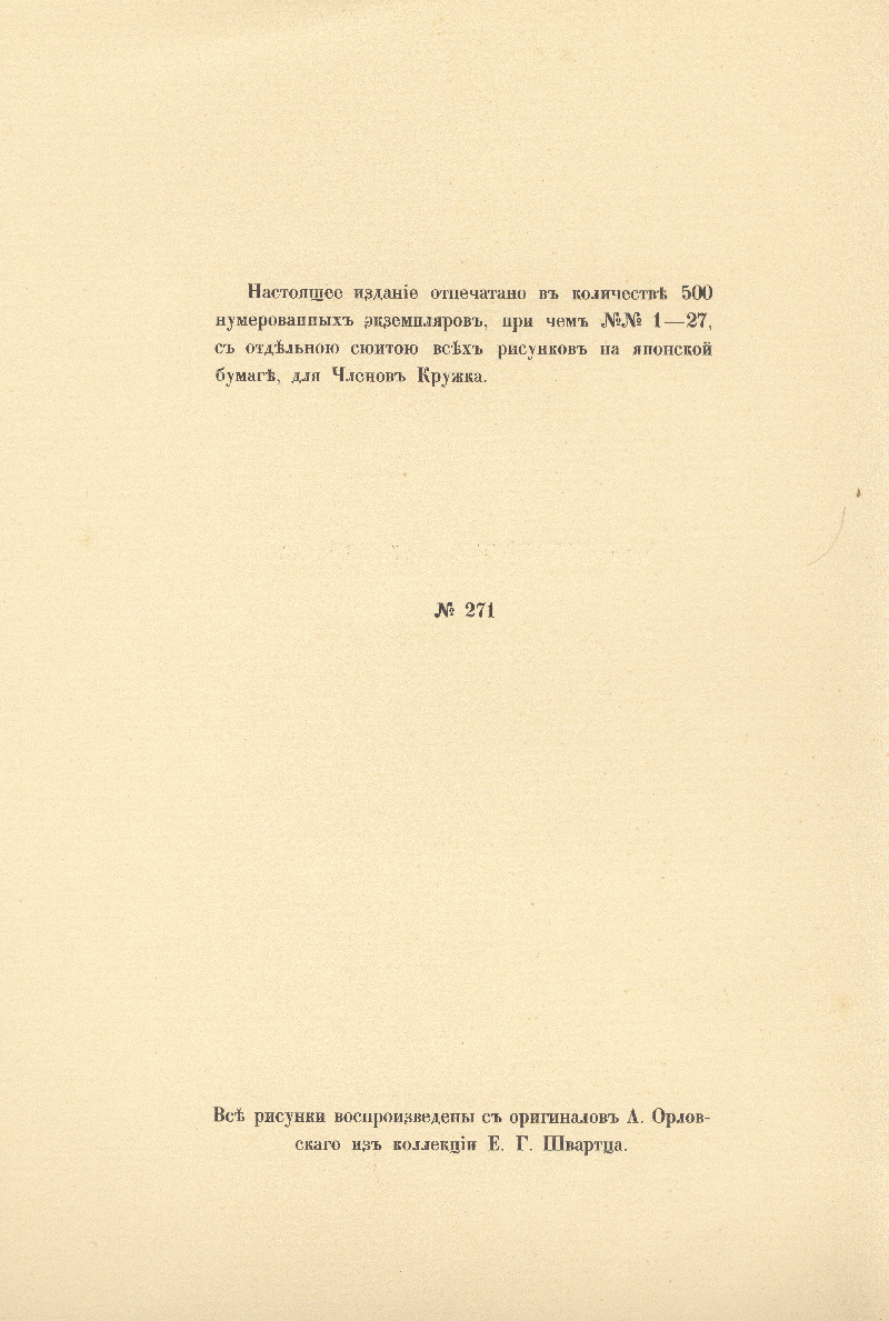 В этом издании Кружок помещает специальные сведения о тираже, прямо указывающие на принадлежность данной книги к библиофильским изданиям: «Настоящее издание отпечатано в количестве 500 нумерованных экземпляров, причем №№ 1–27 с отдельною сюитой всех рисунков на японской бумаге, для членов Кружка. Экземпляр № ...».