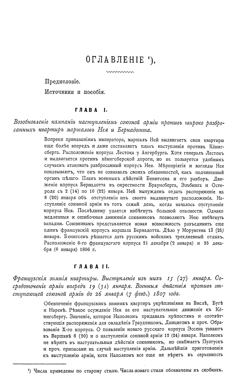 Перевод на русский язык фундаментального многотомного военно-исторического труда по истории войны русско-прусского союза с Наполеоном в 1806-1807 годах, написанного немецким военным историком Оскаром фон Леттов-Форбеком, был подготовлен при штабе Варшавского военного округа под руководством генерал-лейтенанта Генерального штаба, профессора военной истории академии Генерального штаба А.К. Пузыревского, получив при этом одобрение Военного министерства. Деятельность А.К. Пузыревского как одного из выдающихся военных педагогов и просветителей получила в России широкую известность. Представленное им исследование немецкого военного писателя, снабженное многочисленными картами и схемами боевых действий, сих пор представляет научный интерес. Одним из важнейших достоинств данного исследования является то, что автор широко использовал богатейший документальный массив как прусских, так и французских военных архивов, создав объективную картину одного из сложнейших этапов эпохи наполеоновских войн. Русско-прусско-французская война 1806-1807 гг. война между 4-й коалицией европейских держав (Великобритания, Россия, Пруссия, Саксония, Швеция) и наполеоновской Францией. Фактически эти две кампании являлась продолжением русско-австро-французской войны 1805 г. Не имея общего плана войны, союзники действовали несогласованно, что позволило Наполеону разбить их поочерёдно. Так 2 (14) октября 1806 г. в масштабном сражении под Йеной и Ауэрштадтом французская армия разгромила прусско-саксонские войска, после чего наполеоновские войска оккупировали большую часть Пруссии и 12 (24) октября заняли Берлин. Русская армия в составе трёх корпусов (около 160 тыс. чел.) под командованием генерал-фельдмаршала М. Ф. Каменского сосредоточилась в районе Пултуск, Остроленка, Брест-Литовск, выдвинув передовые отряды к Висле. 16 (28) ноября французские войска заняли Варшаву. Наполеон предпринял попытку окружить главные силы русских войск, но 14 (26) декабря в сражении под Пултуском русские войска сорвали этот план, нанеся поражение корпусу маршала Ж. Ланна. Затем русская армия отошла в район Тыкоцина, а наполеоновские войска расположились на зимние квартиры. 4 (16) января 1807 русская армия под командованием нового командующего генерал-адъютанта Л.Л. Беннигсена начала наступление из района Бялы в Восточную Пруссию с целью не допустить занятия французами Кенигсберга и Пиллау и нанести поражение изолированным корпусам Нея и Бернадота. Наполеон, узнав о продвижении русских войск, 20 января (1 февраля) направил главные силы на север, пытаясь обойти левый фланг русской армии и отрезать экспедиционные силы русских от России. Русские войска, ведя арьергардные бои, отошли к Прейсиш-Эйлау, где 26–27 января (7– 8 февраля) произошло встречное упорное сражение, в котором русские войска успешно отразили удары наполеоновской армии. 2 (14) июня 1807 г. в сражении под Фридландом русская армия, проявив чудеса героизма и мужества, вследствие неадекватных мер командования, была вынуждена отступить. В июне 1807 г. состоялось свидание Наполеона с императором Александром I в Тильзите и был подписан тяжёлый для России вынужденный союзный договор с наполеоновской Францией. Все эти военно-исторические события детально изложены в данном труде.