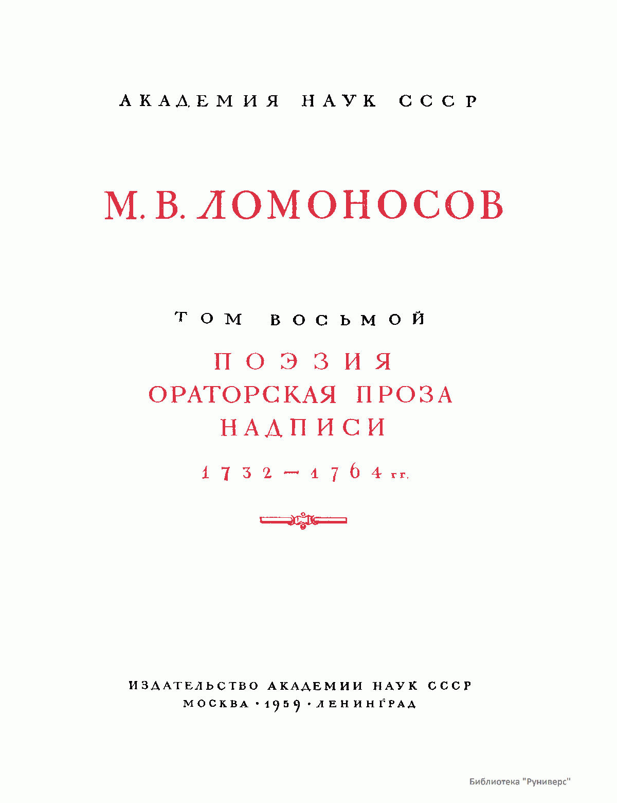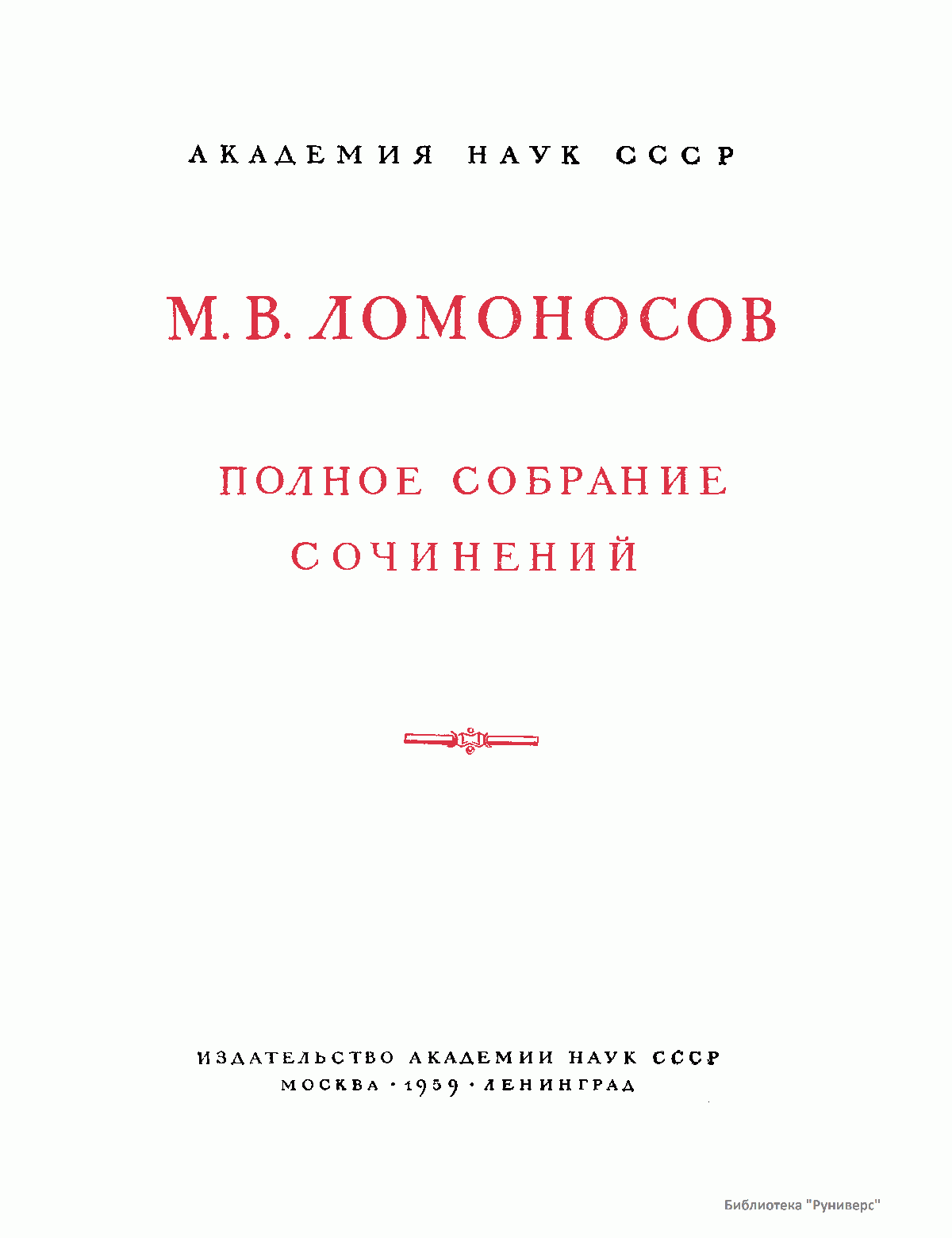 Михаил Васильевич Ломоносов – человек необъятных дарований и научной энергии, величайшей деятель культуры XVIII века, лучший продолжатель идей петровского времени. Ломоносов работал в области всех известных в его время наук и почти в каждой сделал замечательные открытия. Он был философом, физиком, химиком, металлургом, географом, биологом, астрономом, филологом одновременно. В этом отношении Ломоносов был последним представителем фаланги великих людей, выдвинутых во всей Европе эпохой Возрождения, людей типа Леонардо да Винчи или Галилея. Белинский так писал о Ломоносове: «Ослепительно и прекрасно было это явление. Оно доказало собой, что человек есть человек во всяком состоянии и во всяком климате, что гений умеет торжествовать над всеми препятствиями, какие ни противопоставит ему враждебная судьба, что, наконец, русский способен ко всему великому и прекрасному». Настоящее издание сочинений Ломоносова наиболее полное из всех. Оно подготовлено на основе большой работы ученых по разысканию, описанию и изучению разнообразного и богатейшего научного наследия Ломоносова. В издание включается несколько сот документов, не вошедших в последнее академическое издание и ранее не опубликованных. В число этих документов входит ряд статей и заметок научного значения, автобиографически документы, переводы и разнообразные служебные бумаги, характеризующие Ломоносова как выдающегося организатора русской науки и просвещения XVIII века. Особо следует отметить документы, относящиеся к деятельности Ломоносова как ученого-экспериментатора. Все публикуемые тексты сверены с первоисточниками – рукописями и прижизненными изданиями. В отдельных случаях, когда ни рукописей, ни прижизненных изданий не сохранилось, текст печатается по наиболее достоверному, критически изученному источнику. Произведения печатаются по новой орфографии с заменой пунктуации Ломоносова современной пунктуацией, но с сохранением, по возможности, всех особенностей, присущих языку Ломоносова. Все тексты, написанные на латинском языке, печатаются одновременно на языке оригинала и в русском переводе. Произведения Ломоносова распределены по разделам его деятельности. Каждому разделу посвящен один том или несколько томов, в зависимости от объема материала. В пределах каждого тома произведения расположены хронологически по времени их написания или публикации. Некоторые отступления от этого принципа сделаны лишь в отдельных случаях, когда это вызывалось необходимостью сохранить органическую связь между однородными произведениями. В отличие от старых изданий сочинений Ломоносова, в которых при распределении материала сначала печатались художественные произведения и филологические труды, в настоящем издании первые тома посвящены научным трудам по физике, химии и другим естественным наукам. В конце каждого тома даются краткие примечания справочного характера к опубликованным в томе работам и указатель личных имен. Настоящее полное собрание сочинений Ломоносова осуществляется Главной редакцией издания при непосредственном участии Комиссии по истории Академии Наук СССР, архива Академии Наук СССР и приглашенных специалистов.