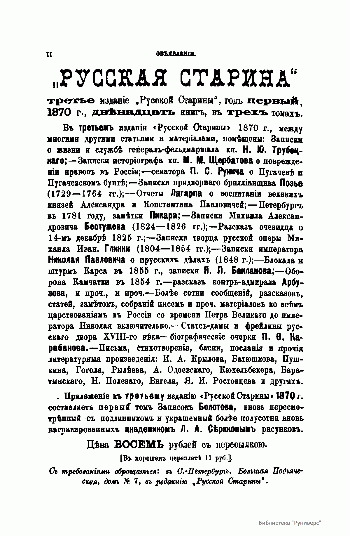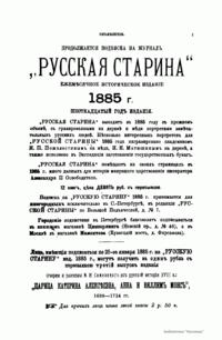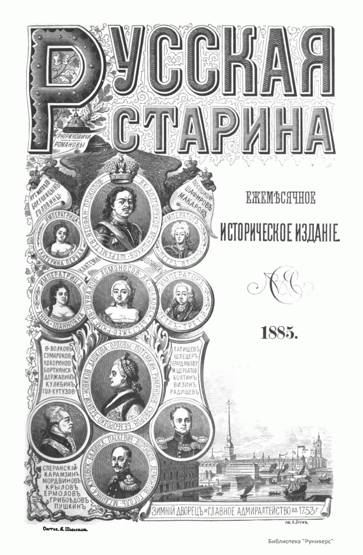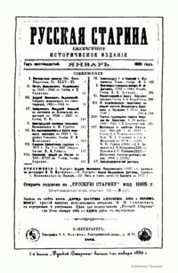 «Русская старина», ежемесячный исторический журнал, выходил в Петербурге в 1870-1918. Основан, издавался и редактировался (1870-1892) М. И. Семевским при участии В. И. Семевского. Последующими редакторами были Н. К. Шильдер (1892-1896), Н. Ф. Дубровин (1896-1904), военные историки С. П. Зыков, П. Н. Воронов.