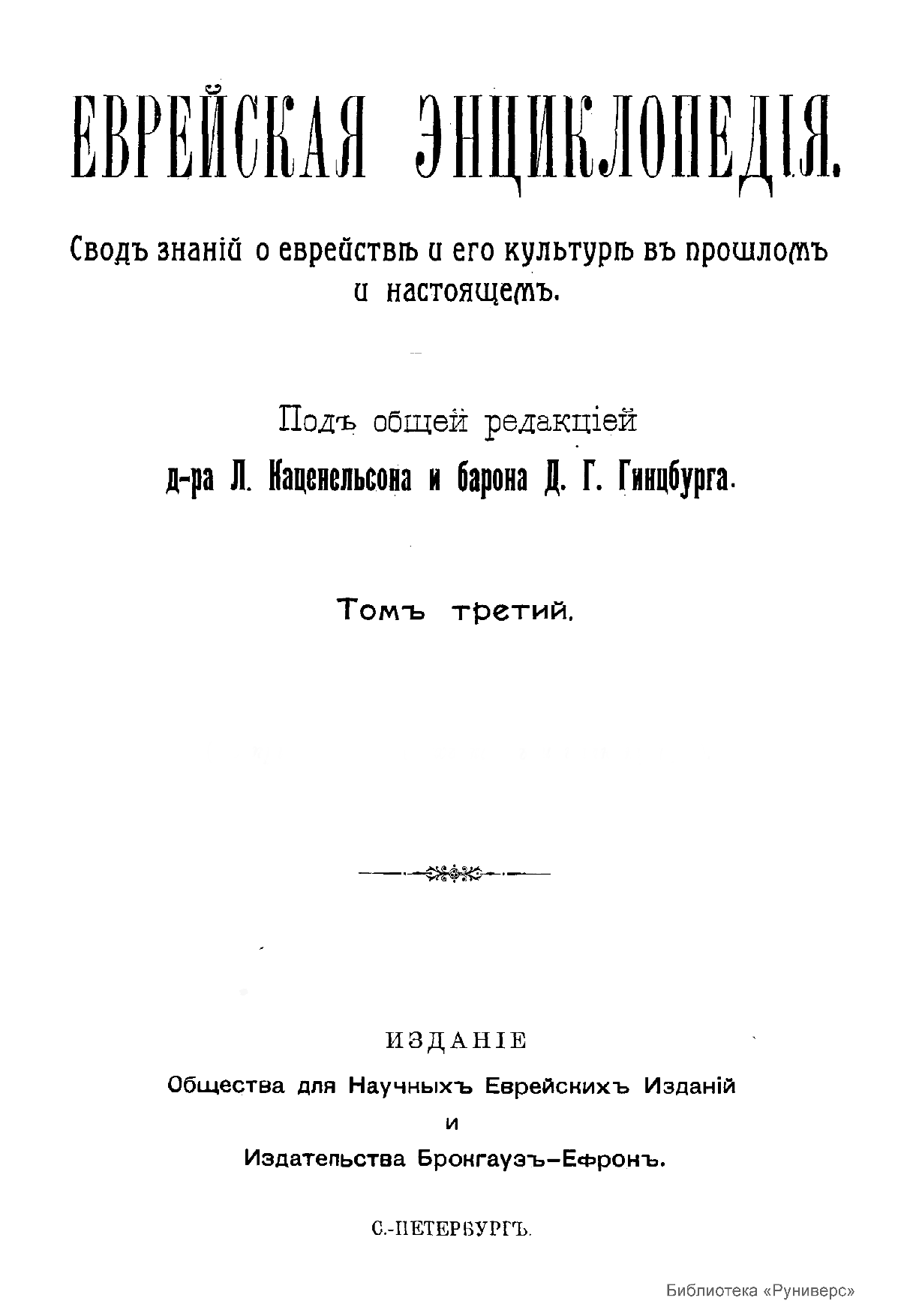 Первый крупный энциклопедический свод знаний о еврействе на русском языке. Энциклопедия была опубликована в 1908 – 1913 гг. в шестнадцати томах в Санкт-Петербурге «Обществом для научных еврейских изданий» и «Издательством Брокгауз – Ефрон». Основой и образцом для нее послужила вышедшая несколько годами ранее двенадцатитомная «The Jewish Encyclopedia» (London; New York, 1901 – 1906). Однако ее материал был существенно дополнен и расширен авторами «Еврейской Энциклопедии Брокгауза» во всем, что касалось истории, культуры и современного положения еврейских общин в Восточной Европе. В работе над «Еврейской энциклопедией Брокгауза» принимали участие виднейшие представители российской иудаики, гебраистики и востоковедения: А.Гаркави, Д. Гинцбург, Ю Гессен, С. Дубнов, И. Маркон, Н. Переферкович. «Еврейская энциклопедия Брокгауза» до сих пор остается одним из важнейших источников справочной информации и статистических данных о почти шестимиллионном еврейском населении Российской империи начала XX в. И потому ее данные можно отнести к числу ценных источников сведений по социально-политической, этнической, культурно-религиозной истории и исторической демографии России и сопредельных ей стран.