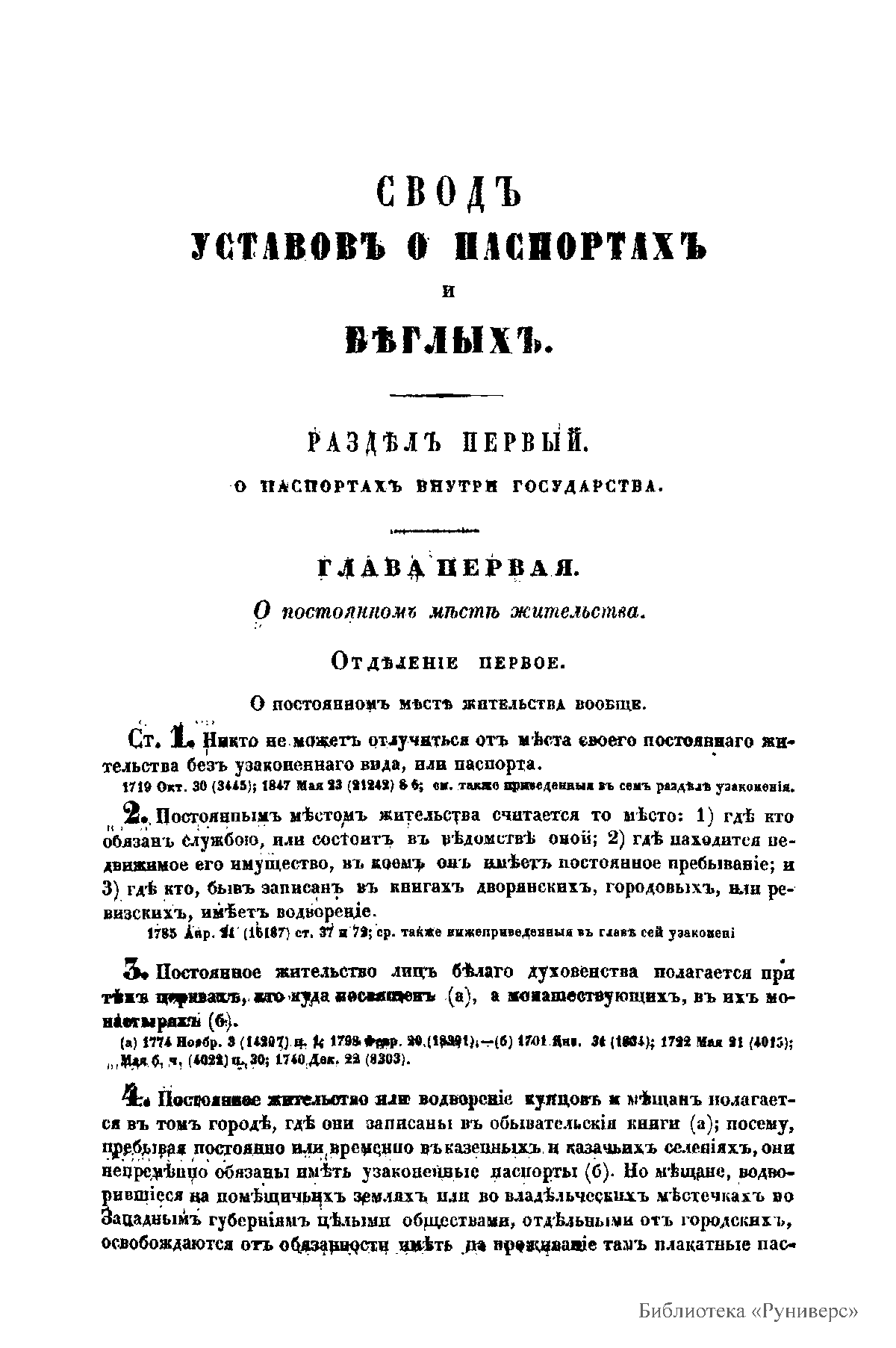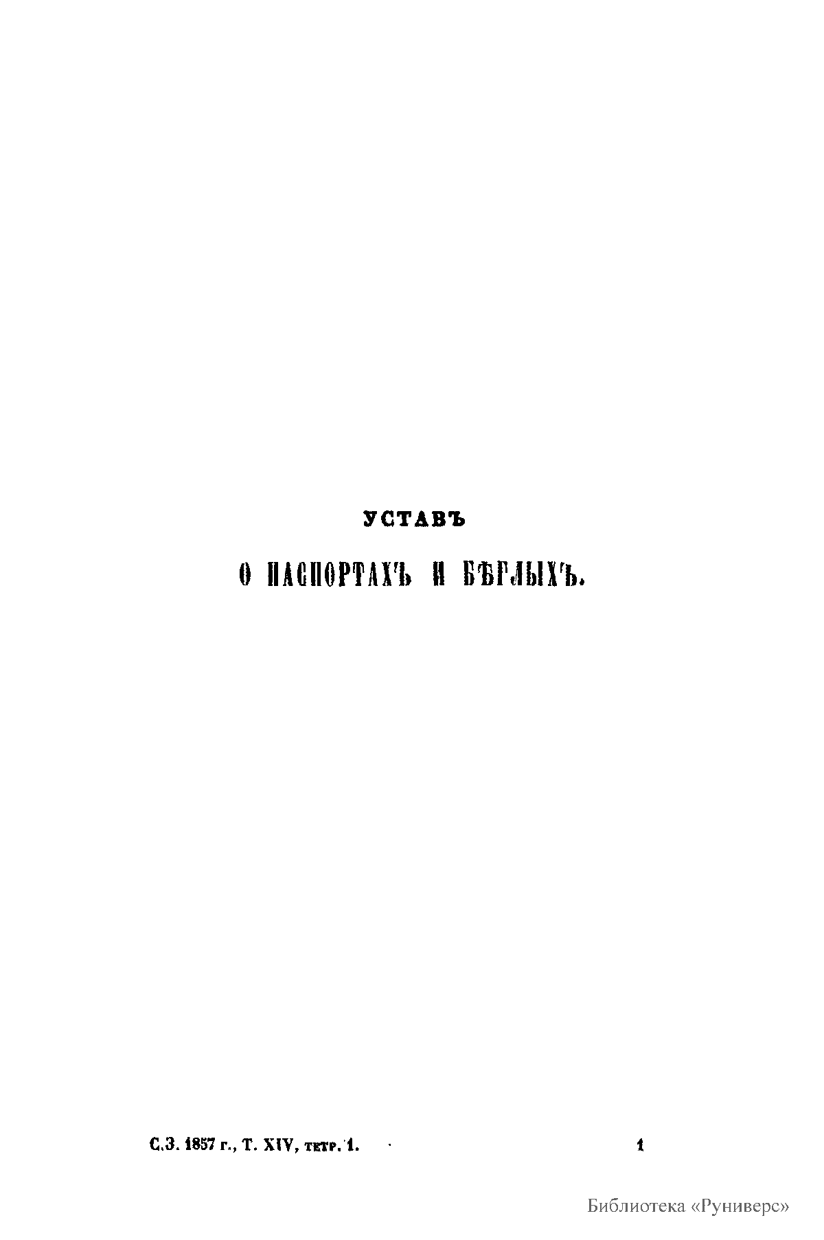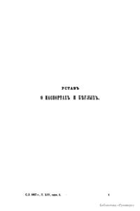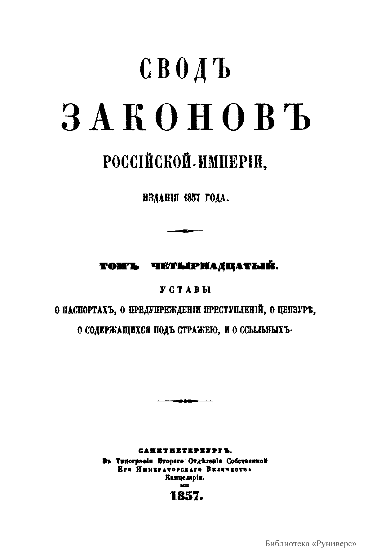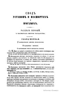 Сводъ законовъ Россiйской имперiи. Томъ четырнадцатый. Уставы о паспортахъ, о предупрежденiи преступленiй, о цензурѣ, о содержащихся подъ стражею, и о ссыльныхъ