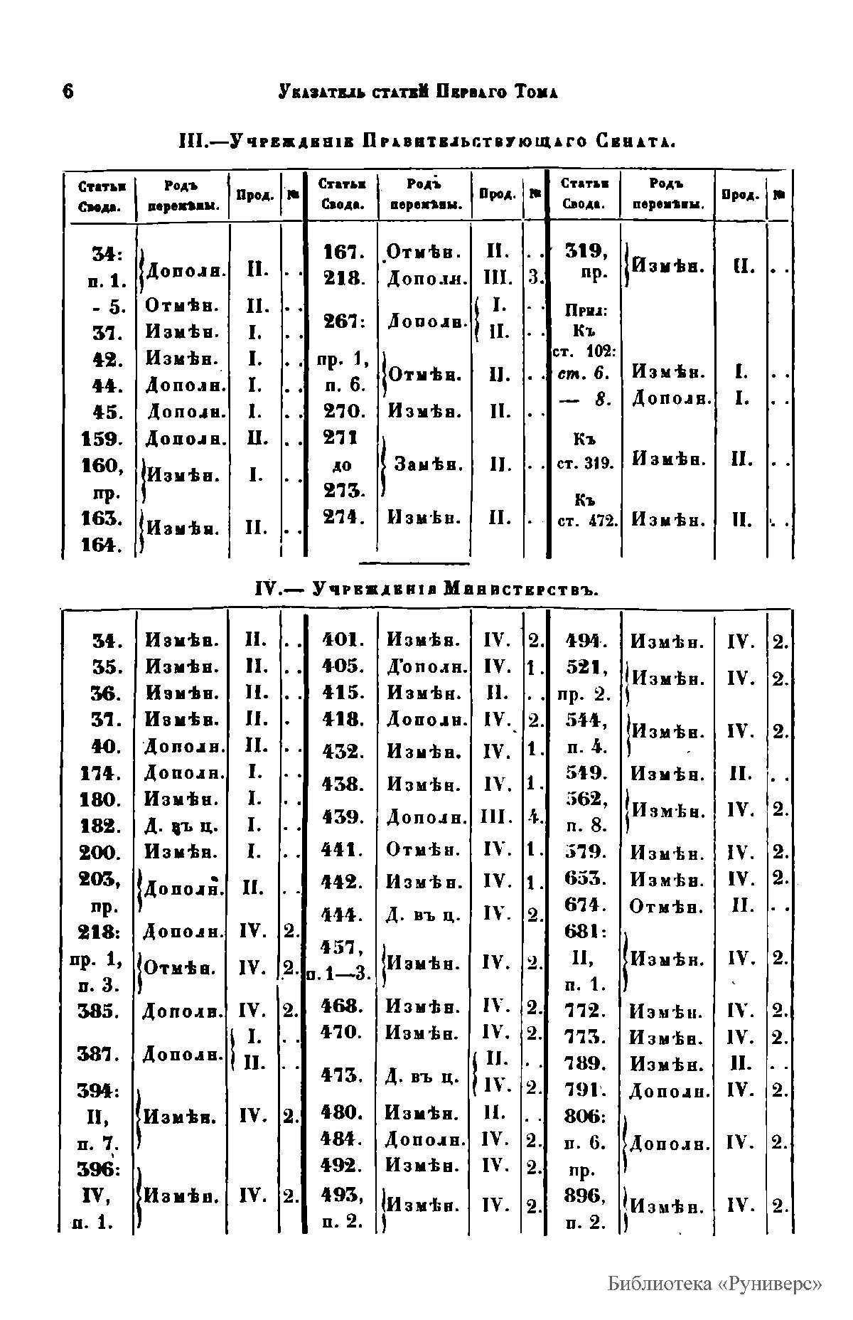Свод законов Российской империи— официальное собрание расположенных в тематическом порядке действующих законодательных актов Российской империи, созданное при Николае I. Впервые он был напечатан в 1832 году. Манифестом 31 января 1833 года Свод законов был объявлен действующим источником права с 1 января 1835 года. Первое издание 1832 года и последующие 1842-го и 1857 года состояли из пятнадцати томов. После 1857 года Свод законов полностью не переиздавался, а выходили лишь отдельные тома. В качестве отдельного – 16-го тома в 1885 году вышли Судебные уставы. Между изданиями Свода законов выходили ежегодные и сводные (за несколько лет) «Продолжения» Свода законов с указанием на упраздненные и измененные статьи. В своде законов собраны все реально действовавшие в определенный момент времени законы по тем или иным проблемам права, это справочник для юристов. Отбор законодательного материала для включения в Свод производился на основе Полного собрания законов (первое Полное собрание законов, появившееся в 1830 году, состояло из 45 томов, содержащих 30 920 актов и 6 томов приложений). Собрание законов – это в большой степени историческое издание. По нему можно изучать развитие, направление правительственной мысли в стране. Это летопись отечественного законотворчества. Изучая страницу за страницей эту летопись, мы можем узнать, что в тот или иной момент истории являлось злобой дня.