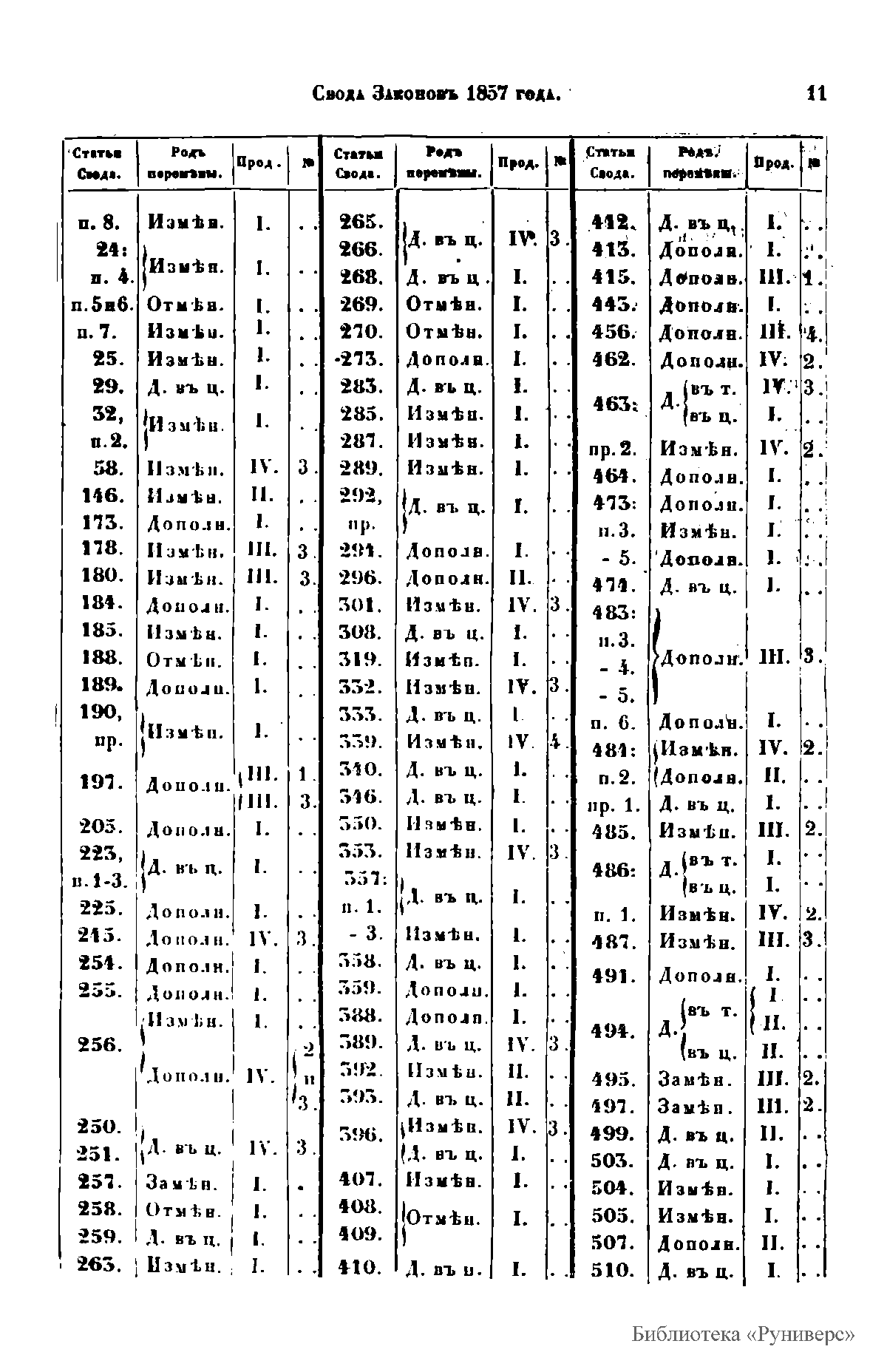 Свод законов Российской империи— официальное собрание расположенных в тематическом порядке действующих законодательных актов Российской империи, созданное при Николае I. Впервые он был напечатан в 1832 году. Манифестом 31 января 1833 года Свод законов был объявлен действующим источником права с 1 января 1835 года. Первое издание 1832 года и последующие 1842-го и 1857 года состояли из пятнадцати томов. После 1857 года Свод законов полностью не переиздавался, а выходили лишь отдельные тома. В качестве отдельного – 16-го тома в 1885 году вышли Судебные уставы. Между изданиями Свода законов выходили ежегодные и сводные (за несколько лет) «Продолжения» Свода законов с указанием на упраздненные и измененные статьи. В своде законов собраны все реально действовавшие в определенный момент времени законы по тем или иным проблемам права, это справочник для юристов. Отбор законодательного материала для включения в Свод производился на основе Полного собрания законов (первое Полное собрание законов, появившееся в 1830 году, состояло из 45 томов, содержащих 30 920 актов и 6 томов приложений). Собрание законов – это в большой степени историческое издание. По нему можно изучать развитие, направление правительственной мысли в стране. Это летопись отечественного законотворчества. Изучая страницу за страницей эту летопись, мы можем узнать, что в тот или иной момент истории являлось злобой дня.