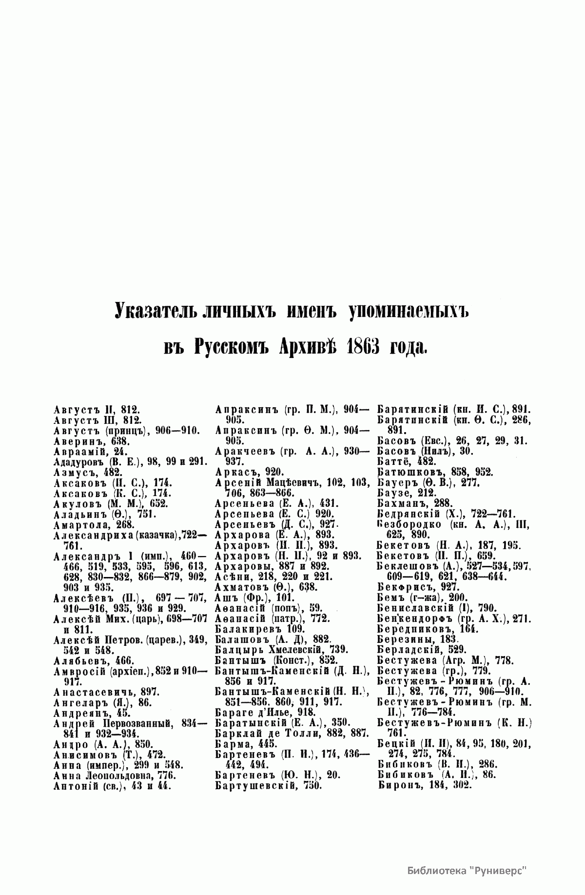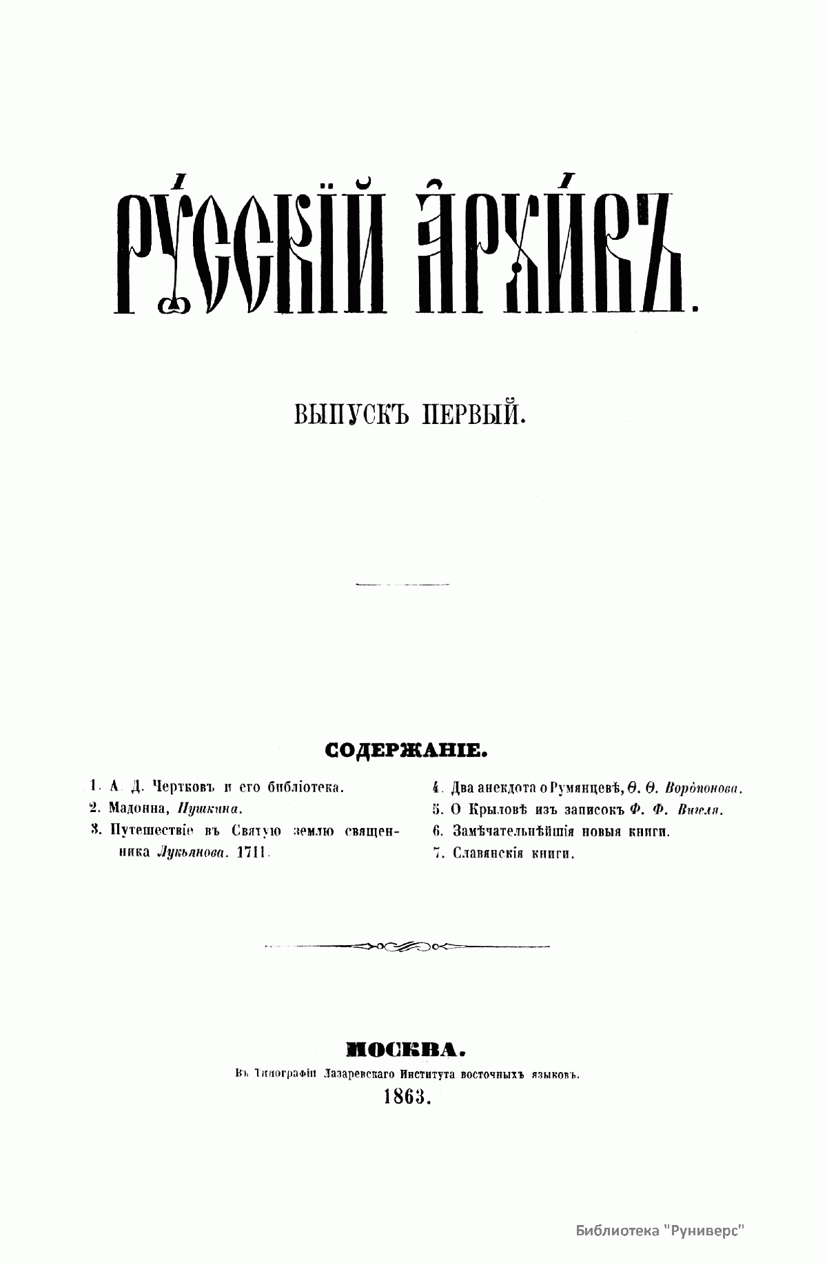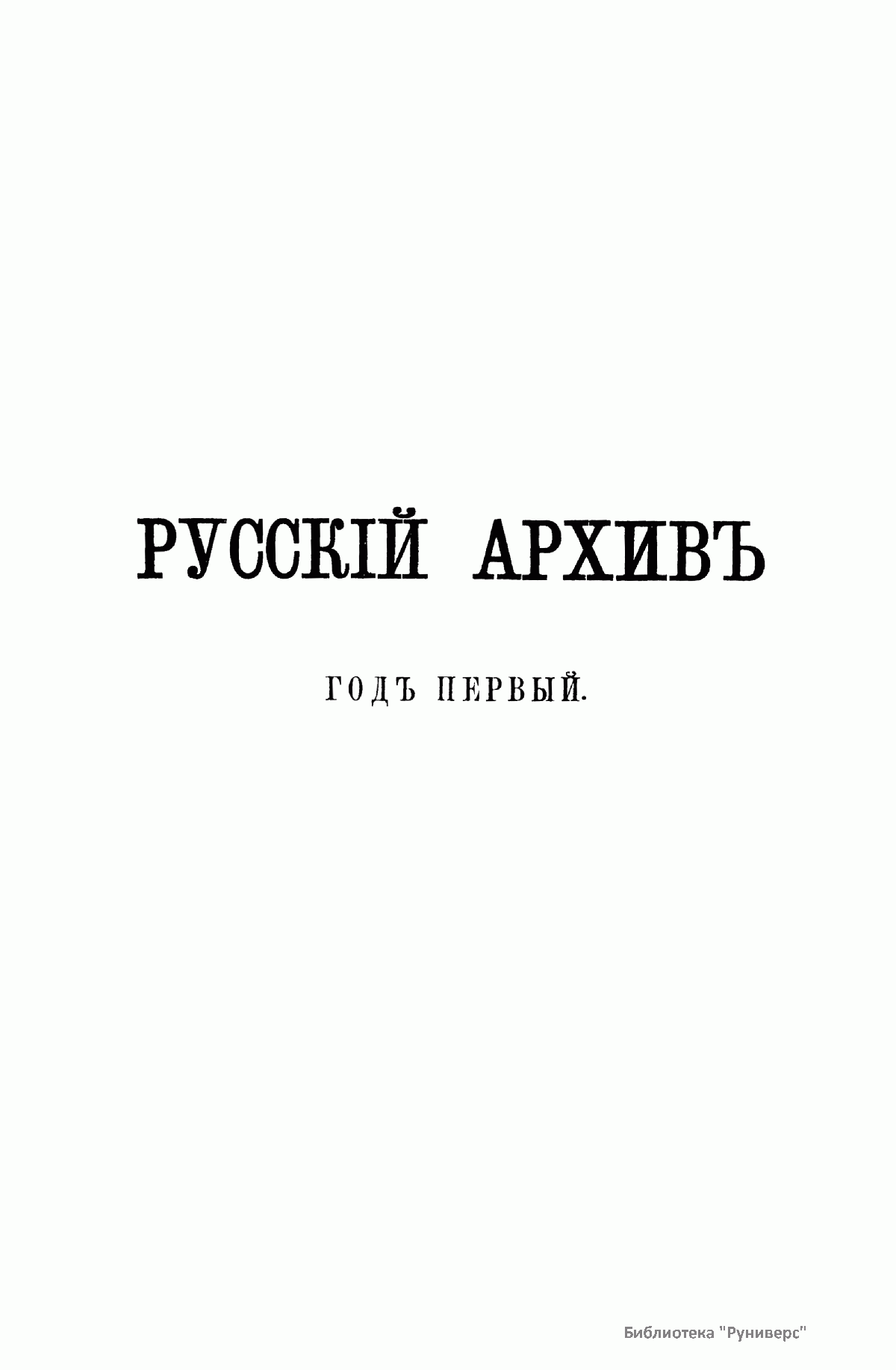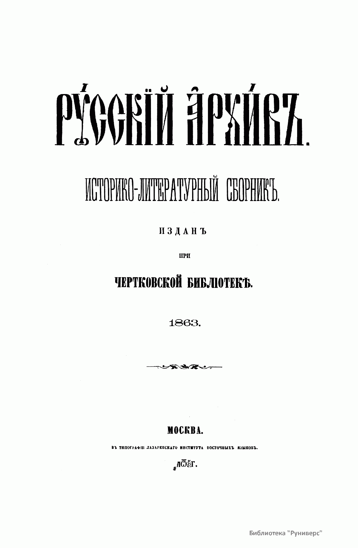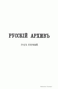 «Русский архив» — ежемесячный историко-литературный журнал, издававшийся в Москве с 1863 по 1917 год. Создателем и продолжительные годы редактором журнала был П. И. Бартенев – историк, археограф, библиограф. Этот журнал называли «живой картиной былого», поскольку он содержал преимущественно публикации неизданных мемуарных, эпистолярных, литературно-художественных и ведомственных документальных материалов, освещавших культурную и политическую историю России в XVIII и XIX вв. По числу опубликованных источников «Русский архив» стоит на первом месте среди русских исторических журналов.