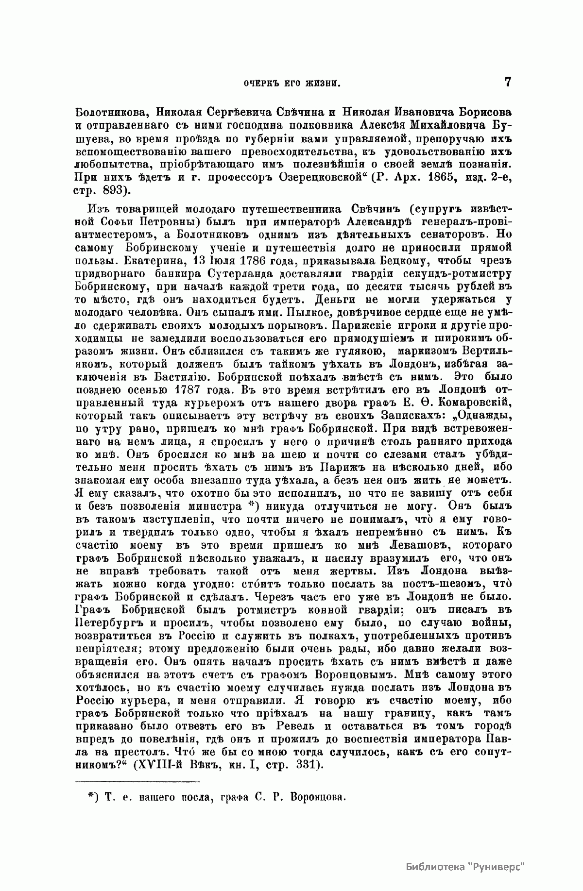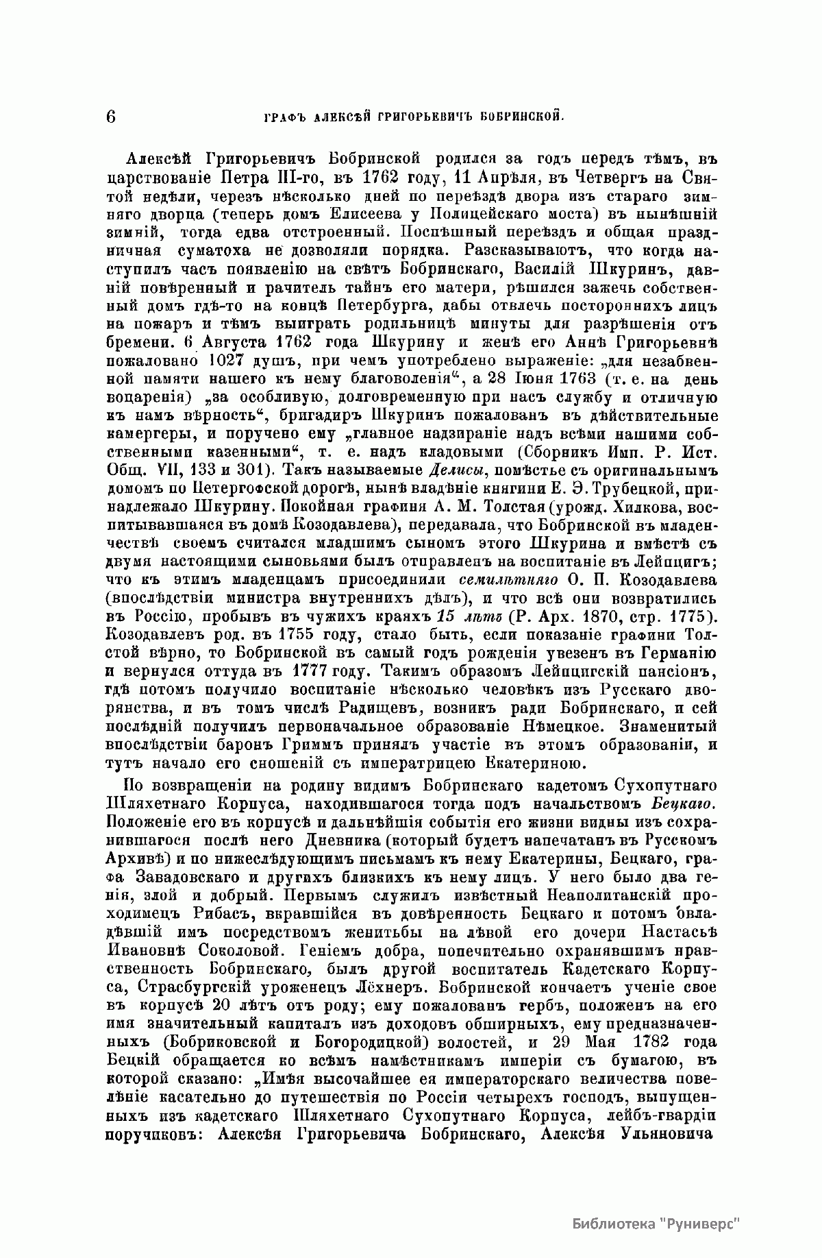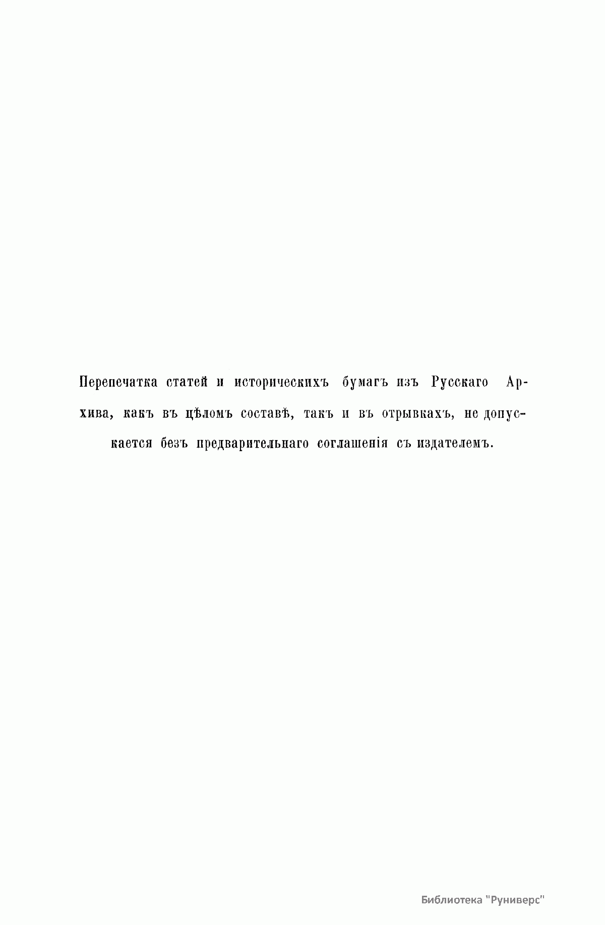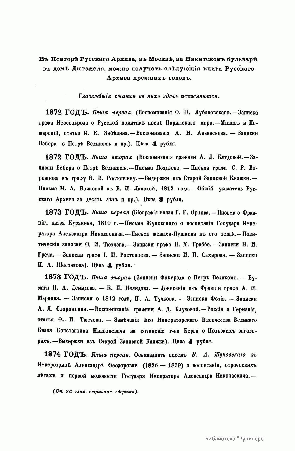 «Русский архив» — ежемесячный историко-литературный журнал, издававшийся в Москве с 1863 по 1917 год. Создателем и продолжительные годы редактором журнала был П. И. Бартенев – историк, археограф, библиограф. Этот журнал называли «живой картиной былого», поскольку он содержал преимущественно публикации неизданных мемуарных, эпистолярных, литературно-художественных и ведомственных документальных материалов, освещавших культурную и политическую историю России в XVIII и XIX вв. По числу опубликованных источников «Русский архив» стоит на первом месте среди русских исторических журналов.