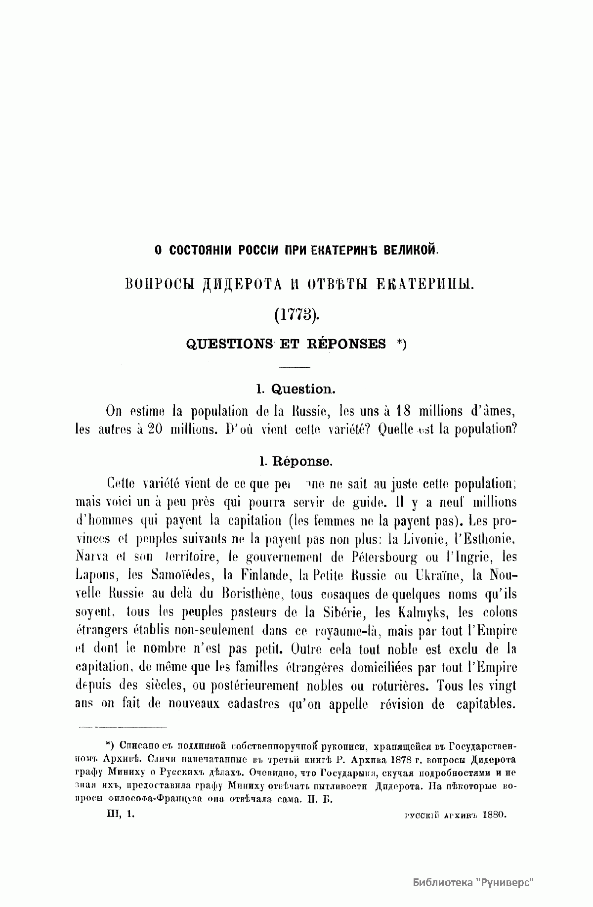 «Русский архив» — ежемесячный историко-литературный журнал, издававшийся в Москве с 1863 по 1917 год. Создателем и продолжительные годы редактором журнала был П. И. Бартенев – историк, археограф, библиограф. Этот журнал называли «живой картиной былого», поскольку он содержал преимущественно публикации неизданных мемуарных, эпистолярных, литературно-художественных и ведомственных документальных материалов, освещавших культурную и политическую историю России в XVIII и XIX вв. По числу опубликованных источников «Русский архив» стоит на первом месте среди русских исторических журналов.