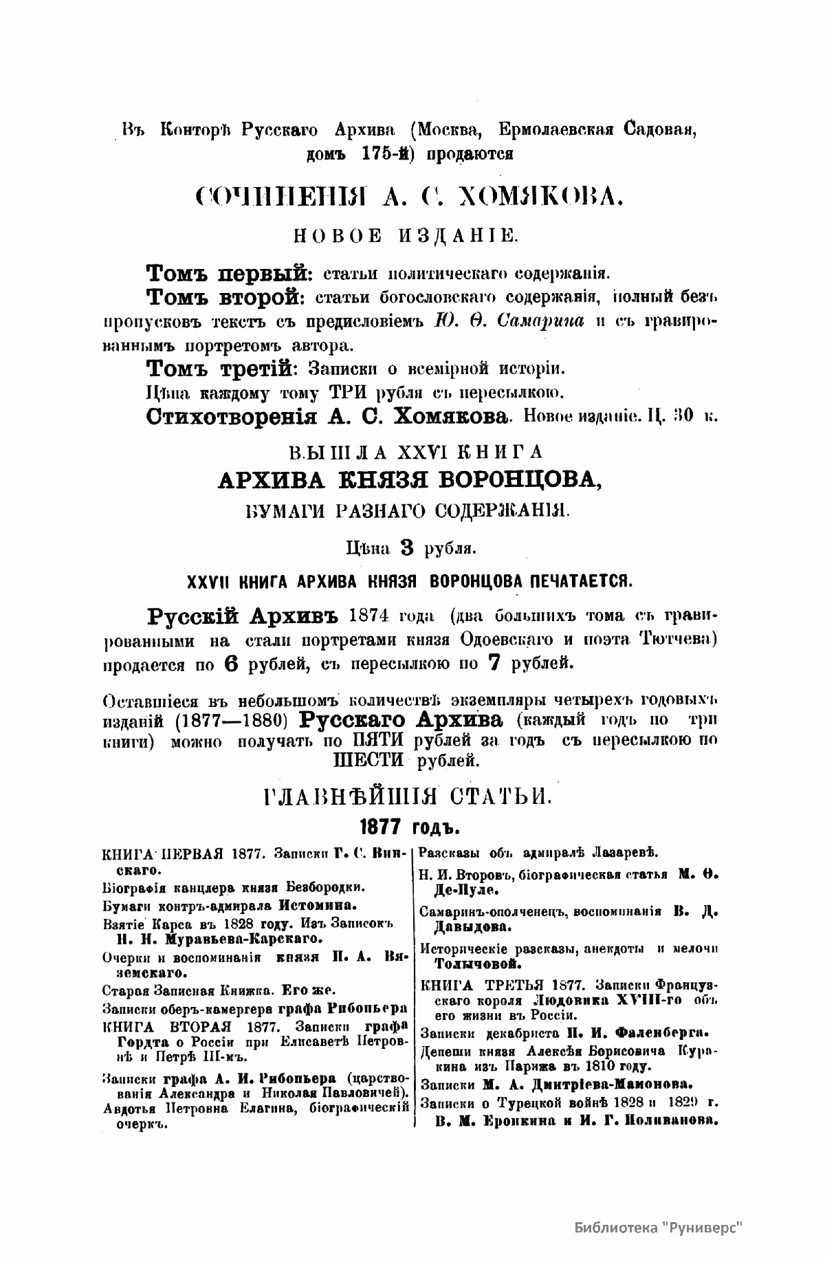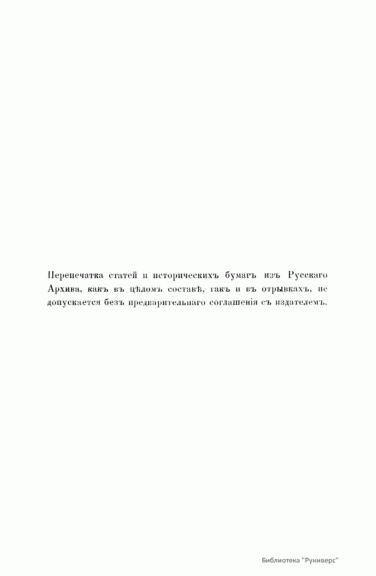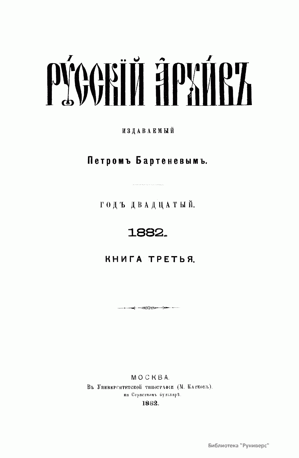 «Русский архив» — ежемесячный историко-литературный журнал, издававшийся в Москве с 1863 по 1917 год. Создателем и продолжительные годы редактором журнала был П. И. Бартенев – историк, археограф, библиограф. Этот журнал называли «живой картиной былого», поскольку он содержал преимущественно публикации неизданных мемуарных, эпистолярных, литературно-художественных и ведомственных документальных материалов, освещавших культурную и политическую историю России в XVIII и XIX вв. По числу опубликованных источников «Русский архив» стоит на первом месте среди русских исторических журналов.