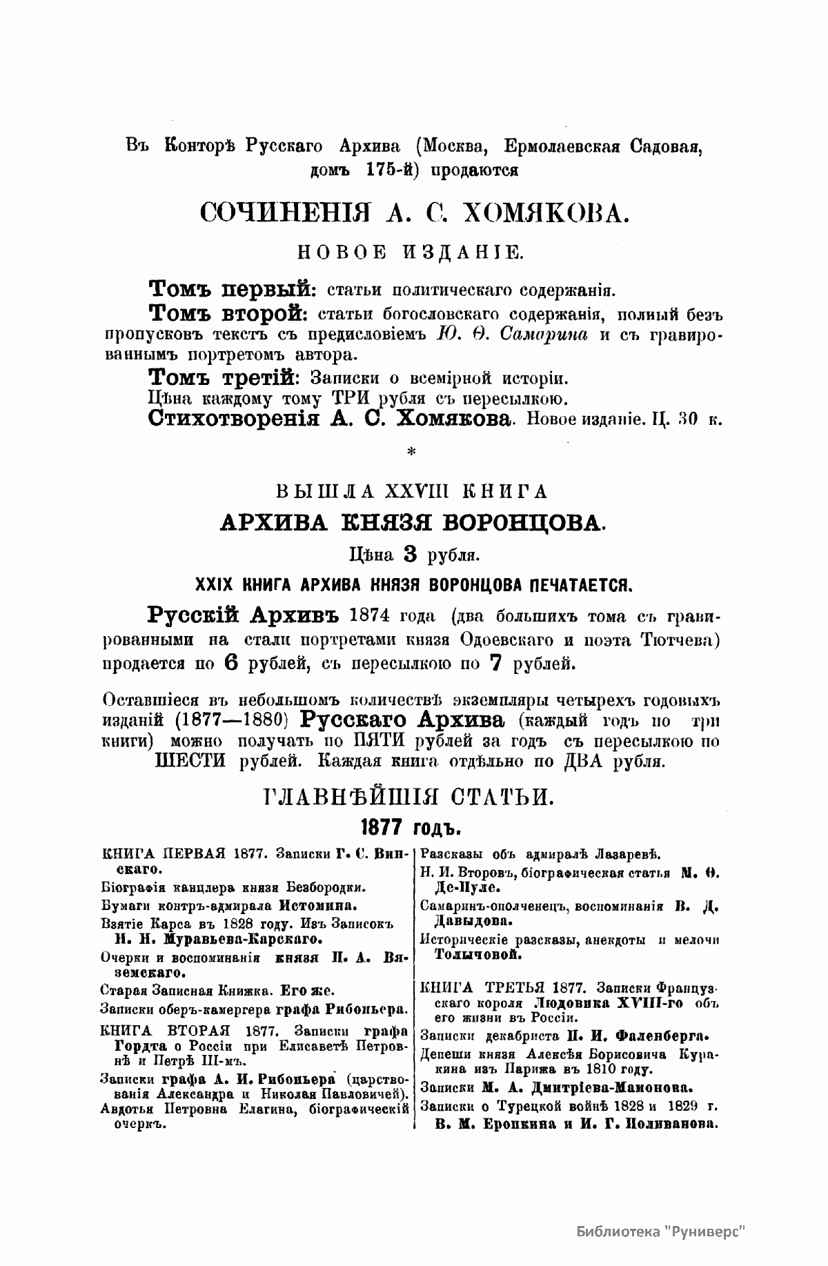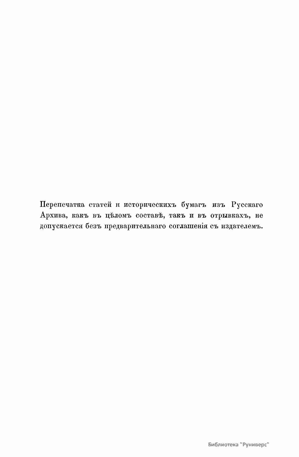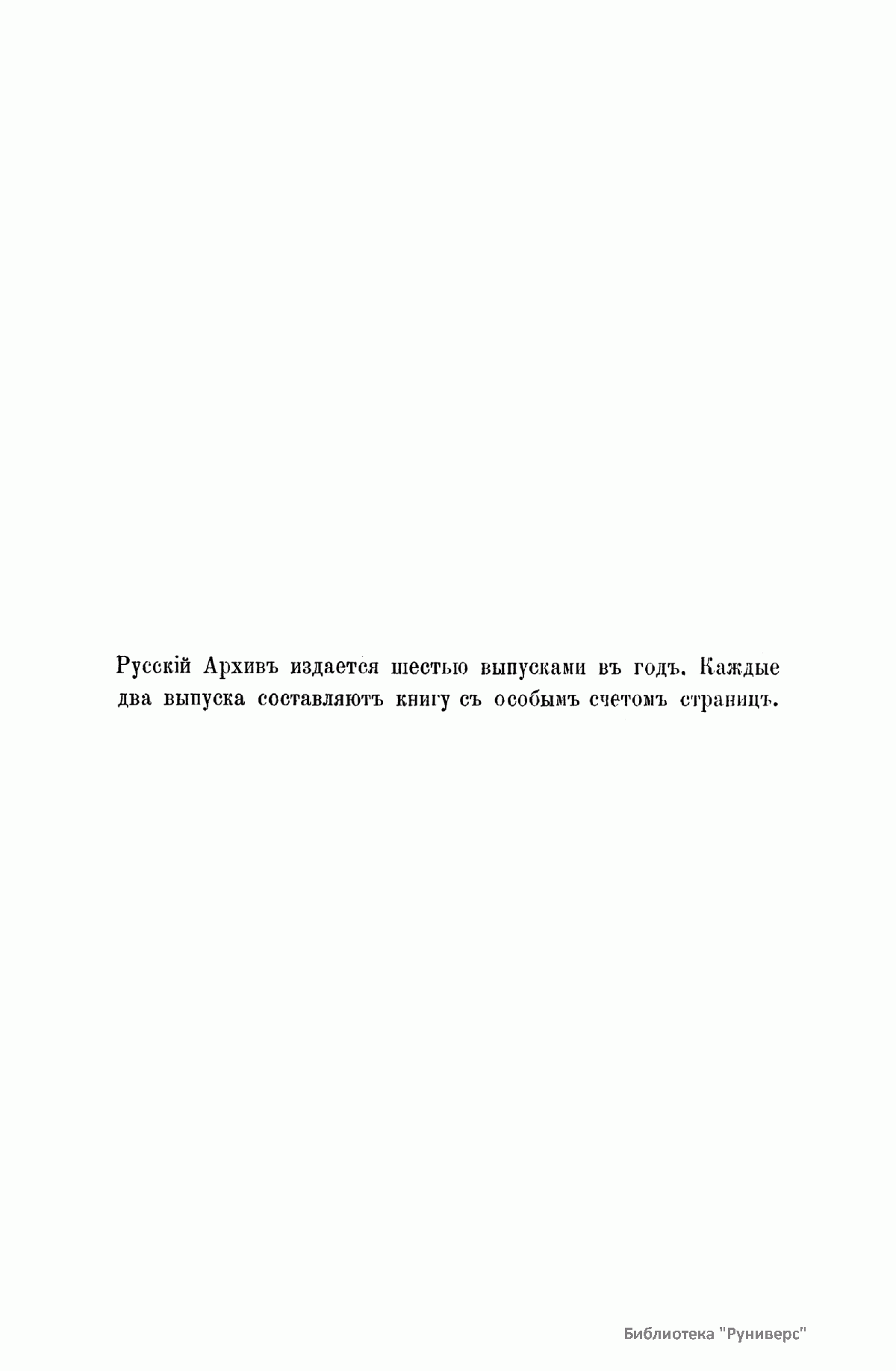 «Русский архив» — ежемесячный историко-литературный журнал, издававшийся в Москве с 1863 по 1917 год. Создателем и продолжительные годы редактором журнала был П. И. Бартенев – историк, археограф, библиограф. Этот журнал называли «живой картиной былого», поскольку он содержал преимущественно публикации неизданных мемуарных, эпистолярных, литературно-художественных и ведомственных документальных материалов, освещавших культурную и политическую историю России в XVIII и XIX вв. По числу опубликованных источников «Русский архив» стоит на первом месте среди русских исторических журналов.