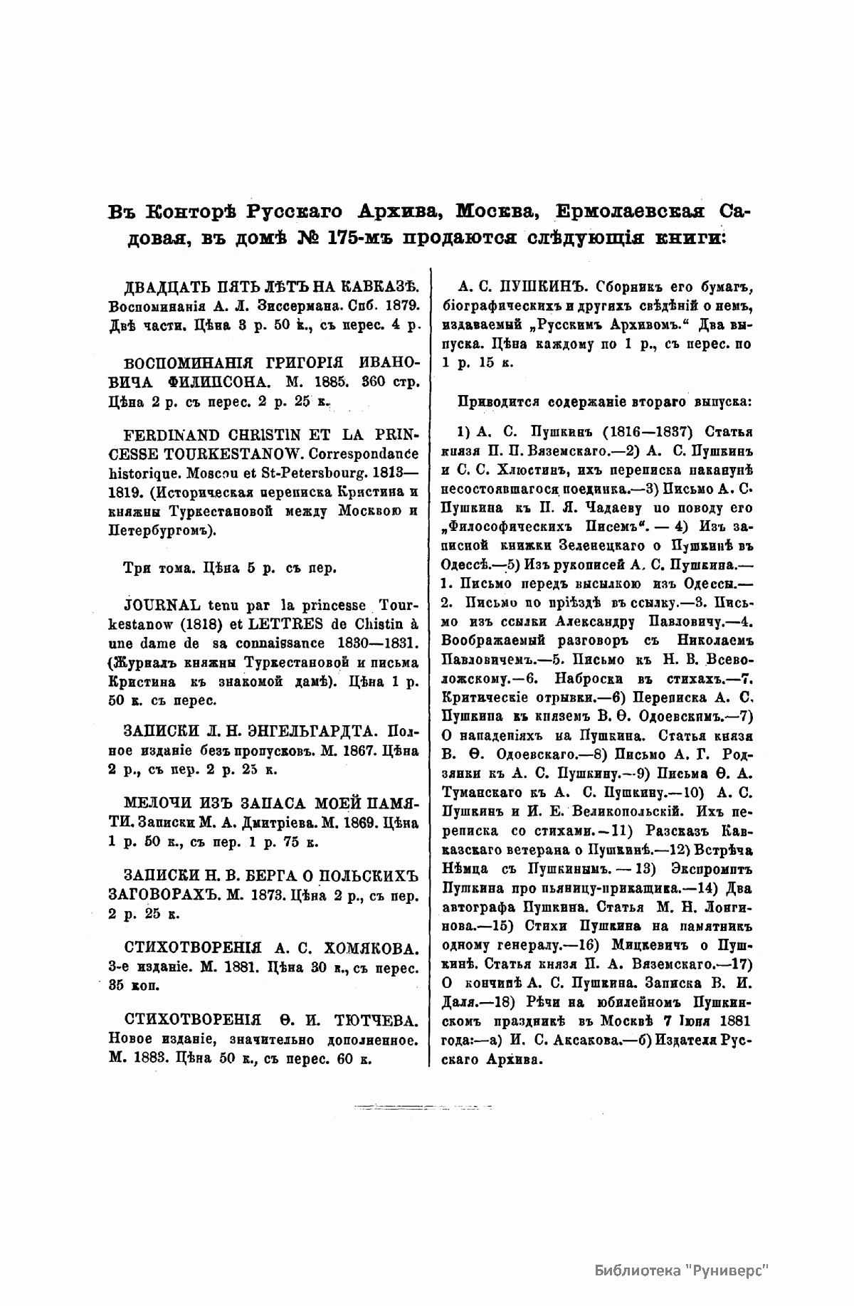 Русскiй архивъ. Историко-литературный сборникъ. 1885. Выпуски 1-4