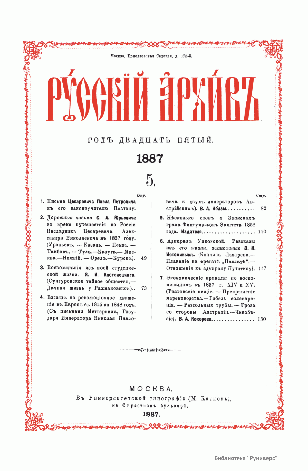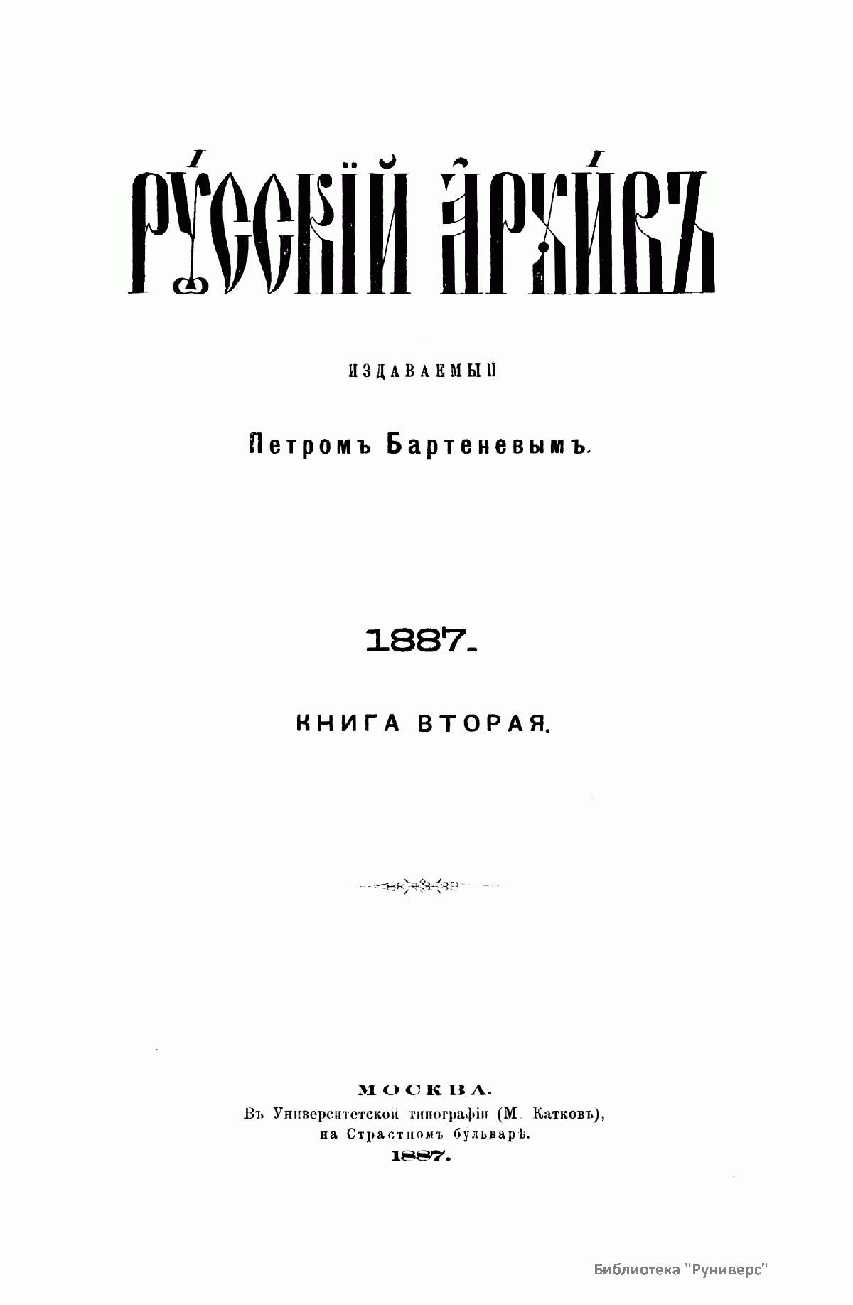 Русскiй архивъ. Историко-литературный сборникъ. 1887. Выпуски 5-8