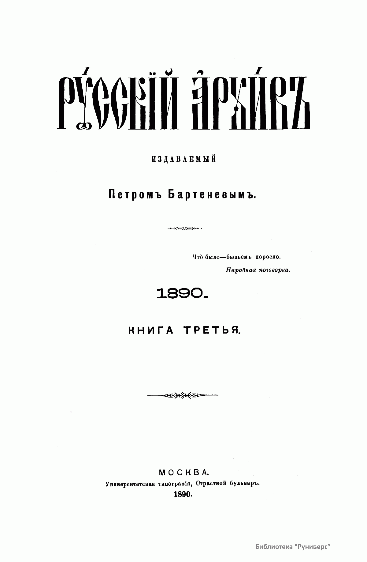 «Русский архив» — ежемесячный историко-литературный журнал, издававшийся в Москве с 1863 по 1917 год. Создателем и продолжительные годы редактором журнала был П. И. Бартенев – историк, археограф, библиограф. Этот журнал называли «живой картиной былого», поскольку он содержал преимущественно публикации неизданных мемуарных, эпистолярных, литературно-художественных и ведомственных документальных материалов, освещавших культурную и политическую историю России в XVIII и XIX вв. По числу опубликованных источников «Русский архив» стоит на первом месте среди русских исторических журналов.