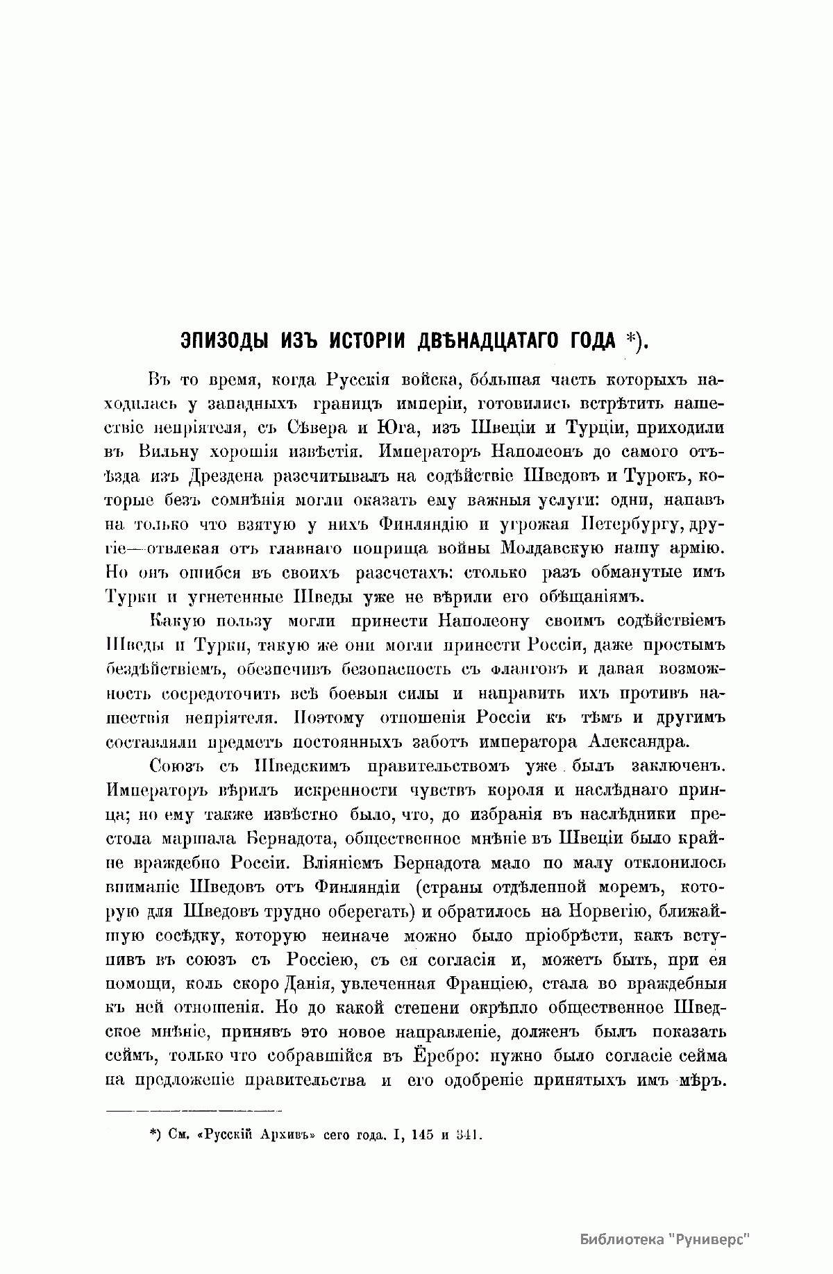«Русский архив» — ежемесячный историко-литературный журнал, издававшийся в Москве с 1863 по 1917 год. Создателем и продолжительные годы редактором журнала был П. И. Бартенев – историк, археограф, библиограф. Этот журнал называли «живой картиной былого», поскольку он содержал преимущественно публикации неизданных мемуарных, эпистолярных, литературно-художественных и ведомственных документальных материалов, освещавших культурную и политическую историю России в XVIII и XIX вв. По числу опубликованных источников «Русский архив» стоит на первом месте среди русских исторических журналов.