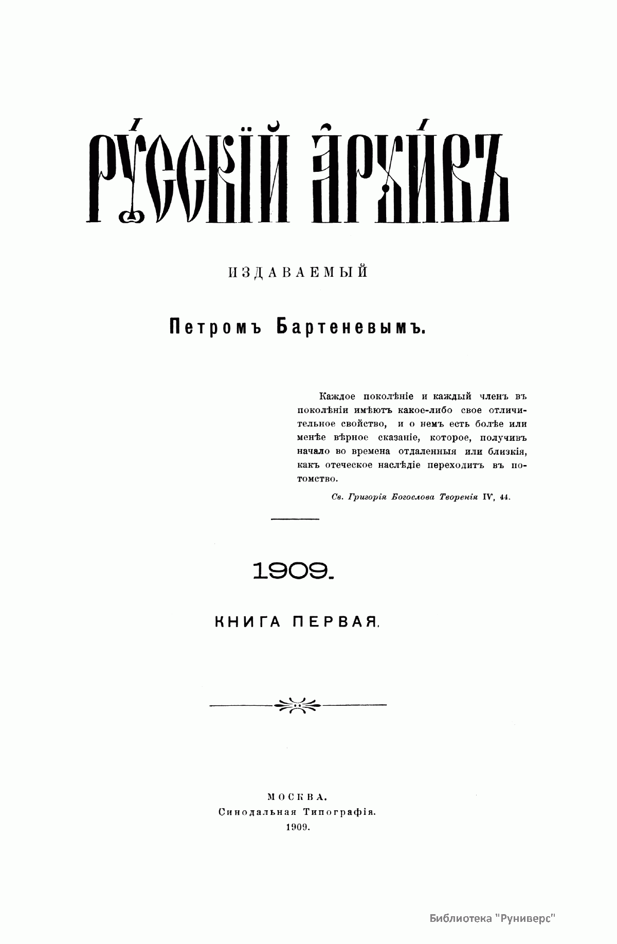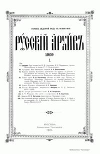 «Русский архив» — ежемесячный историко-литературный журнал, издававшийся в Москве с 1863 по 1917 год. Создателем и продолжительные годы редактором журнала был П. И. Бартенев – историк, археограф, библиограф. Этот журнал называли «живой картиной былого», поскольку он содержал преимущественно публикации неизданных мемуарных, эпистолярных, литературно-художественных и ведомственных документальных материалов, освещавших культурную и политическую историю России в XVIII и XIX вв. По числу опубликованных источников «Русский архив» стоит на первом месте среди русских исторических журналов.