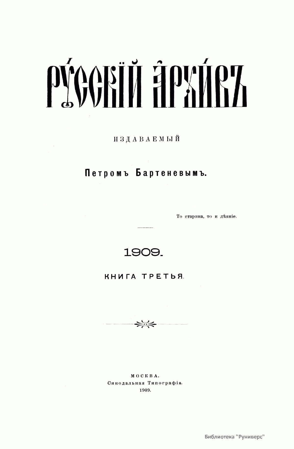 «Русский архив» — ежемесячный историко-литературный журнал, издававшийся в Москве с 1863 по 1917 год. Создателем и продолжительные годы редактором журнала был П. И. Бартенев – историк, археограф, библиограф. Этот журнал называли «живой картиной былого», поскольку он содержал преимущественно публикации неизданных мемуарных, эпистолярных, литературно-художественных и ведомственных документальных материалов, освещавших культурную и политическую историю России в XVIII и XIX вв. По числу опубликованных источников «Русский архив» стоит на первом месте среди русских исторических журналов.