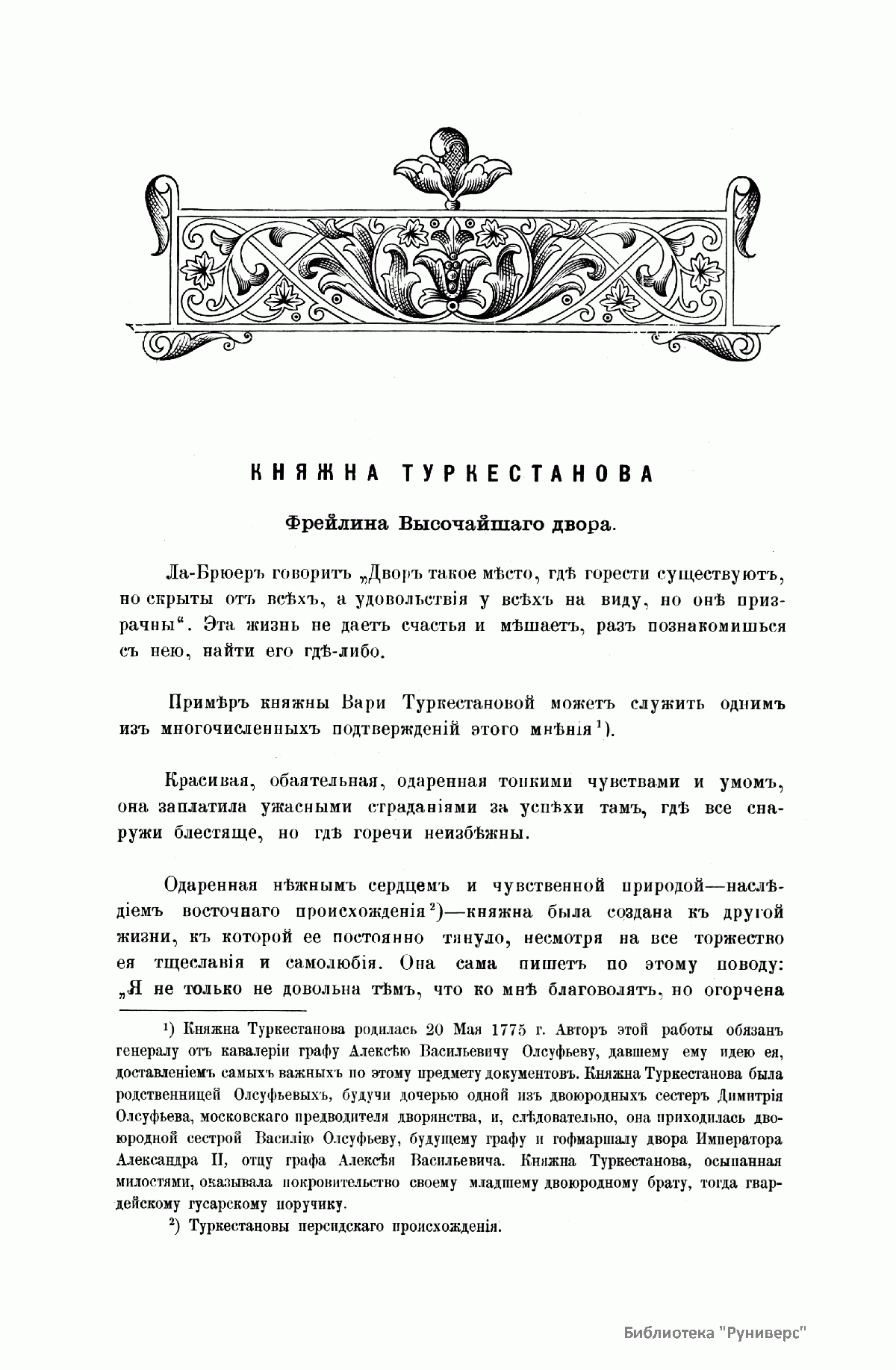 «Русский архив» — ежемесячный историко-литературный журнал, издававшийся в Москве с 1863 по 1917 год. Создателем и продолжительные годы редактором журнала был П. И. Бартенев – историк, археограф, библиограф. Этот журнал называли «живой картиной былого», поскольку он содержал преимущественно публикации неизданных мемуарных, эпистолярных, литературно-художественных и ведомственных документальных материалов, освещавших культурную и политическую историю России в XVIII и XIX вв. По числу опубликованных источников «Русский архив» стоит на первом месте среди русских исторических журналов.