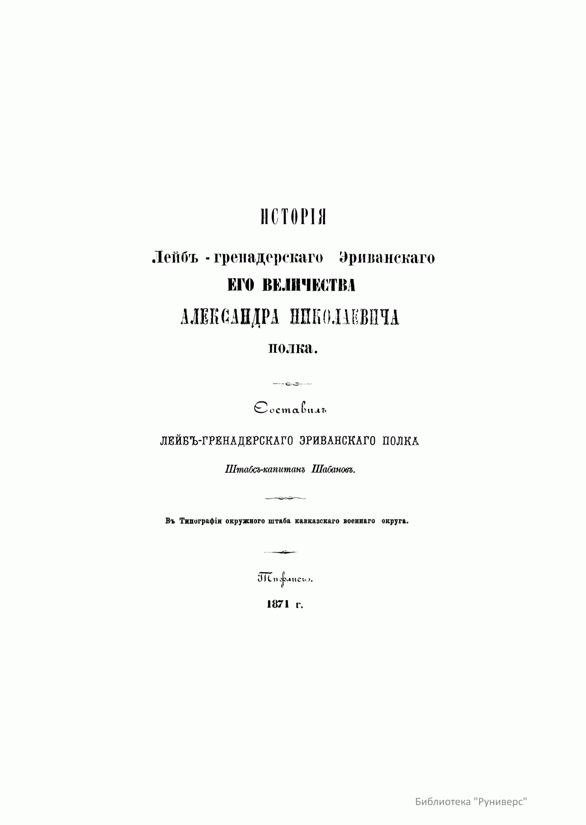 Эриванский 13-й лейб-гренадерский полк — старейший и наиболее титулованный полк русской армии. История полка началась в 1642 г., когда по указу царя Михаила Федоровича был сформирован Московский выборный солдатский Бутырский полк из числа московских стрельцов. Полк веками достигал своей боевой славы на полях битвы за родное отечество. Первым летописцем истории полка стал штабс-капитан этого полка Дмитрий Федорович Шабанов. Для подготовки данного издания автор использовал материалы архивов главного кавказского штаба, канцелярии кавказского наместника, а также полкового архива, хранившего текущую переписку с 1811 г. Боевые действия и события внутренней жизни полка изложены в хронологическом порядке. В повествовании название полка сохранено то, под каким он действовал в течение описываемой эпохи.