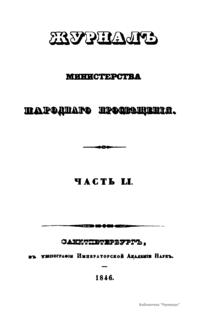 Журнал Министерства народного просвещения выходил с 1834-го по 1917 год. Официальный периодический журнал об успехах просвещения в России. Издатели журнала уверены в том, что «если для каждого человека необходим выход из грубой тьмы невежества и беспрерывное дальнейшее движение к свету, то для народов необходимо попечительное участие правительства в образовании. Только правительство имеет все средства знать и высоту успехов всемирного образования, и настоящие нужды Отечества».