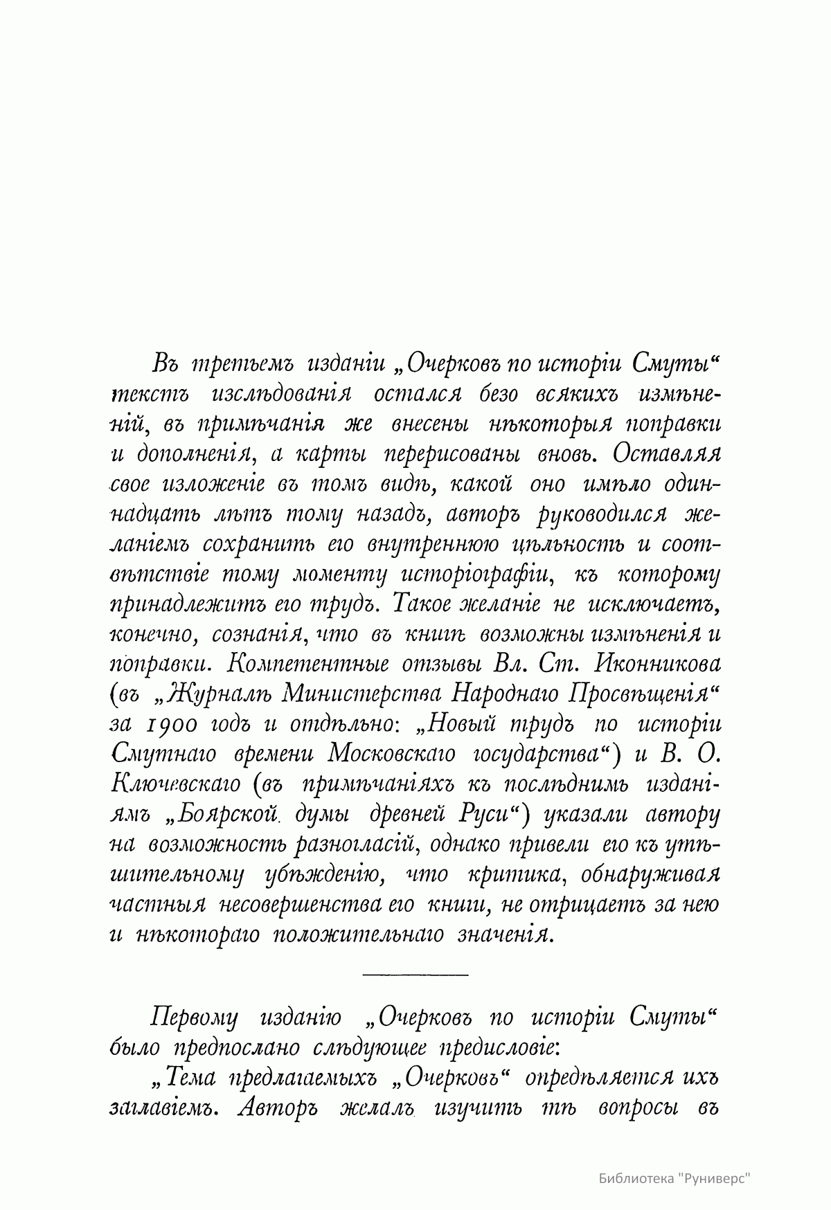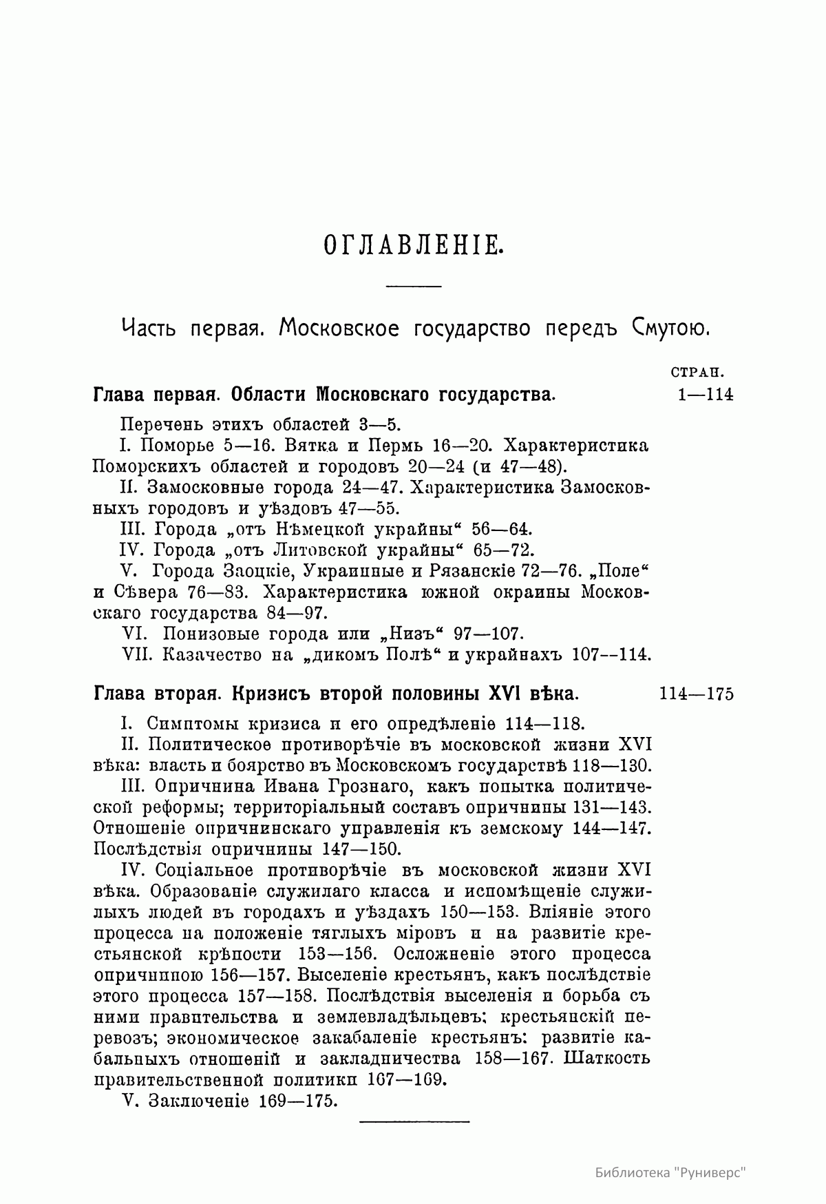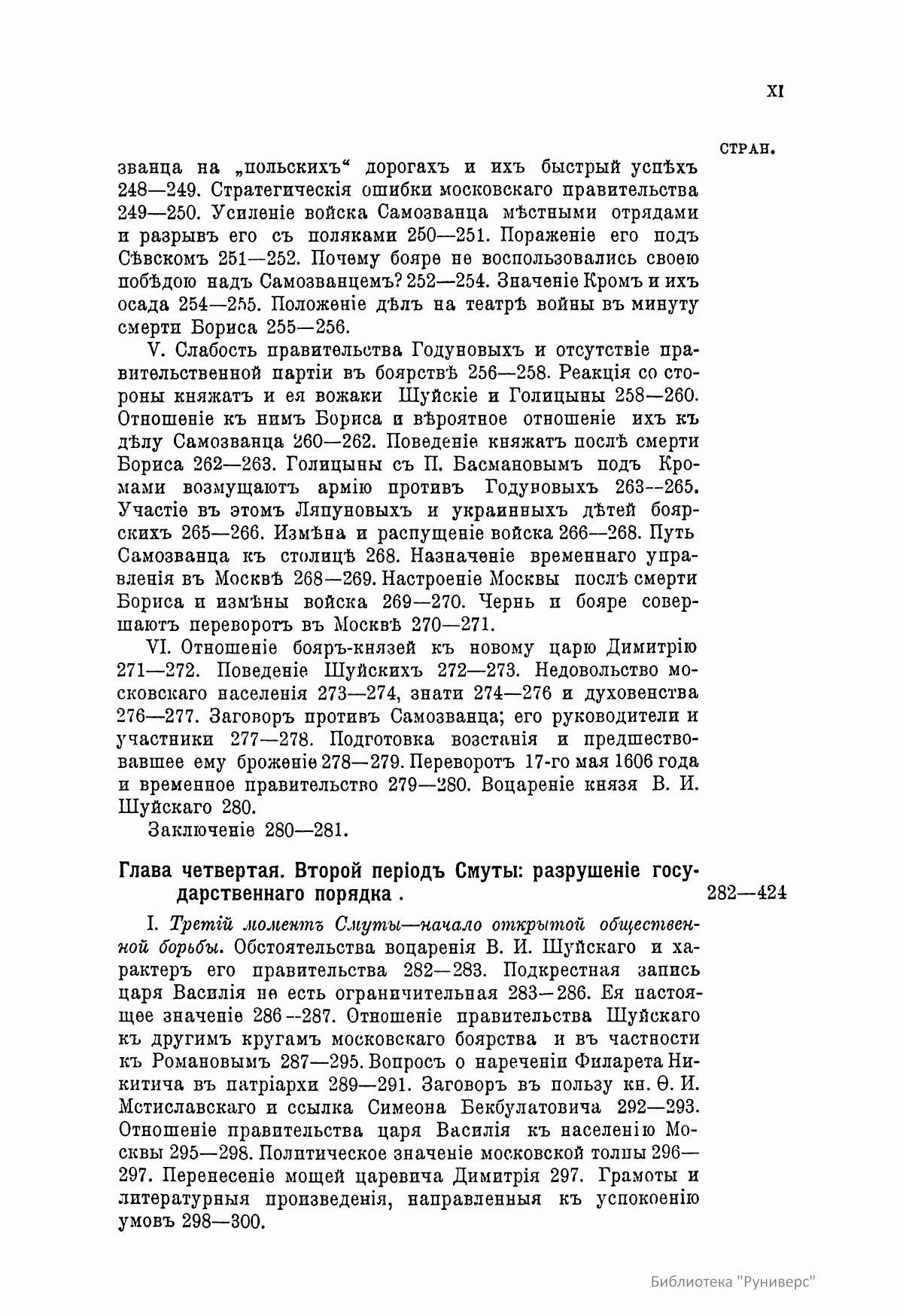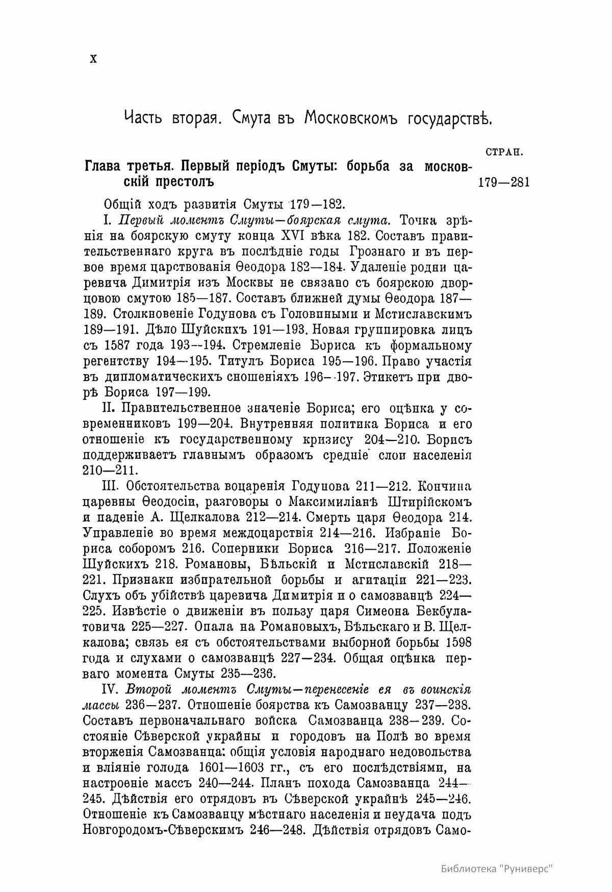 Настоящее издание представляет собой опыт изучения общественного строя и сословных отношений в Смутное время. Автор в своей работе рассматривает следующие положения. 1. Перед смутой Московское государство состояло из разнообразных в географическом и бытовом отношении областей, в которых уже не существовало почвы для сепаратизма. 2. Во второй половине XVI века Московское государство переживало сложный внутренний кризис, имевший особенную остроту для центральных и южных областей страны. 3. Этот кризис был политическим и представлял собой последствия вражды московской верховной власти с родовой княжеской аристократией. Выражением кризиса был насильственный переворот в сфере княжеского и вообще служилого землевладения, известный под именем опричнины. Он привел к полному ослаблению старой аристократии и к образованию в Москве нового слоя дворцовой знати. 4. Кризис был также и социальным и представлял собой последствия крупных перемен, произведенных в области поземельных отношений в интересах служилого класса. Выражением этой стороны кризиса был упадок и запустение земельных хозяйств служилого люда в центре государства и усиленный выход тяглых и крепостных людей на окраины и в «дикое поле». Эти обстоятельства вызывали недовольство населения в средних и южных областях государства. В земледельческой среде шла острая борьба за рабочие руки с общей тенденцией к закрепощению трудовой массы. В этой же последней вырастало оппозиционное отношение к московскому общественному порядку и желание общественных перемен. 5. Таким образом, под действием кризиса московское общество разделилось на враждебные друг другу слои и приближалось к открытому междоусобию настолько явно, что еще до прекращения старой московской династии иноземные и местные наблюдатели событий имели возможность предсказывать неизбежность внутренней Смуты в Московском государстве. 6. В развитии Смуты различаются три периода: династической борьбы, социальной борьбы и борьбы национальной. В первом происходит борьба за московский престол между различными на него претендентами. Во втором совершается разложение государственного порядка и падение политической самостоятельности Москвы вследствие социального междоусобия, вызванного борьбой за престол. В третьем наблюдается ряд попыток со стороны московских людей к восстановлению государственной самостоятельности и общественного порядка, разрушенного Смутой и иноземным завоеванием. 7. В развитии начального периода Смуты можно различить два момента. Первый представляет борьбу небольшого кружка дворцовой знати за власть и престол. Эта борьба имеет характер придворной интриги и заканчивается воцарением Б. Ф. Годунова. Во втором моменте Смута переносится из дворца в воинские массы, которым и передается решающая роль в борьбе за престол различных претендентов на власть. Победителем в этой борьбе стал князь В. И. Шуйский, который соединил вокруг себя остатки княжеской московской аристократии, уцелевшие от опричнины Грозного и Годуновского режима. Установлением реакционного правительства «княжат» завершается первый период Смуты. 8. Второй период Смуты имеет характер открытого социального междоусобия. Воинские массы, вовлеченные в династическую борьбу в качестве силы, решающей дело, поняли свое значение