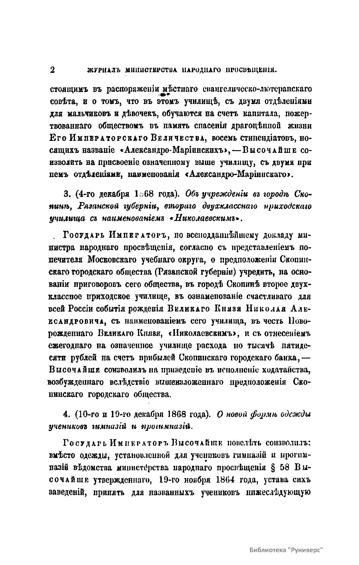 Журнал Министерства народного просвещения выходил с 1834-го по 1917 год. Официальный периодический журнал об успехах просвещения в России. Издатели журнала уверены в том, что «если для каждого человека необходим выход из грубой тьмы невежества и беспрерывное дальнейшее движение к свету, то для народов необходимо попечительное участие правительства в образовании. Только правительство имеет все средства знать и высоту успехов всемирного образования, и настоящие нужды Отечества».