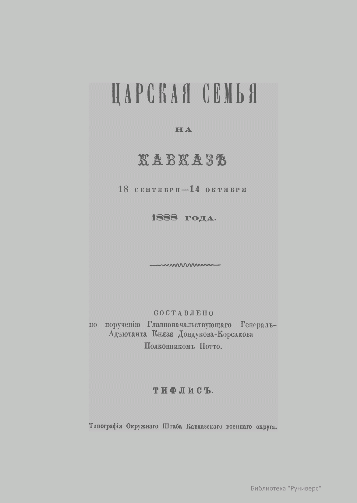 Труды выдающегося русского венного историка, генерал-лейтенанта Василия Александровича Потто (1836–1911), освещающие этапы прихода и становления русской власти в кавказском регионе, историю многолетних кавказских войн и развития казачества, обогатили русскую военную литературу и по праву считаются одними из лучших произведений кавказской тематики. Многие годы В. А. Потто собирал разрозненные документы, военные хроники и архивные материалы, чтобы отобразить общую картину драматических событий, определивших особую роль кавказских войн в истории российского государства. Издание «Царская семья на Кавказе» посвящено поездке Александра III и его семьи на Кавказ осенью 1888 г. Это путешествие имело глубокий исторический смысл, как свидетельство водворенного на Кавказе мира и воссоединения этого края с Российской империей. Рассказ об этом событии выдержан в стилистике репортажа. В хронологическом порядке описан ход поездки, населенные пункты, которые посетила императорская семья, встречи венценосных особ с местными жителями.