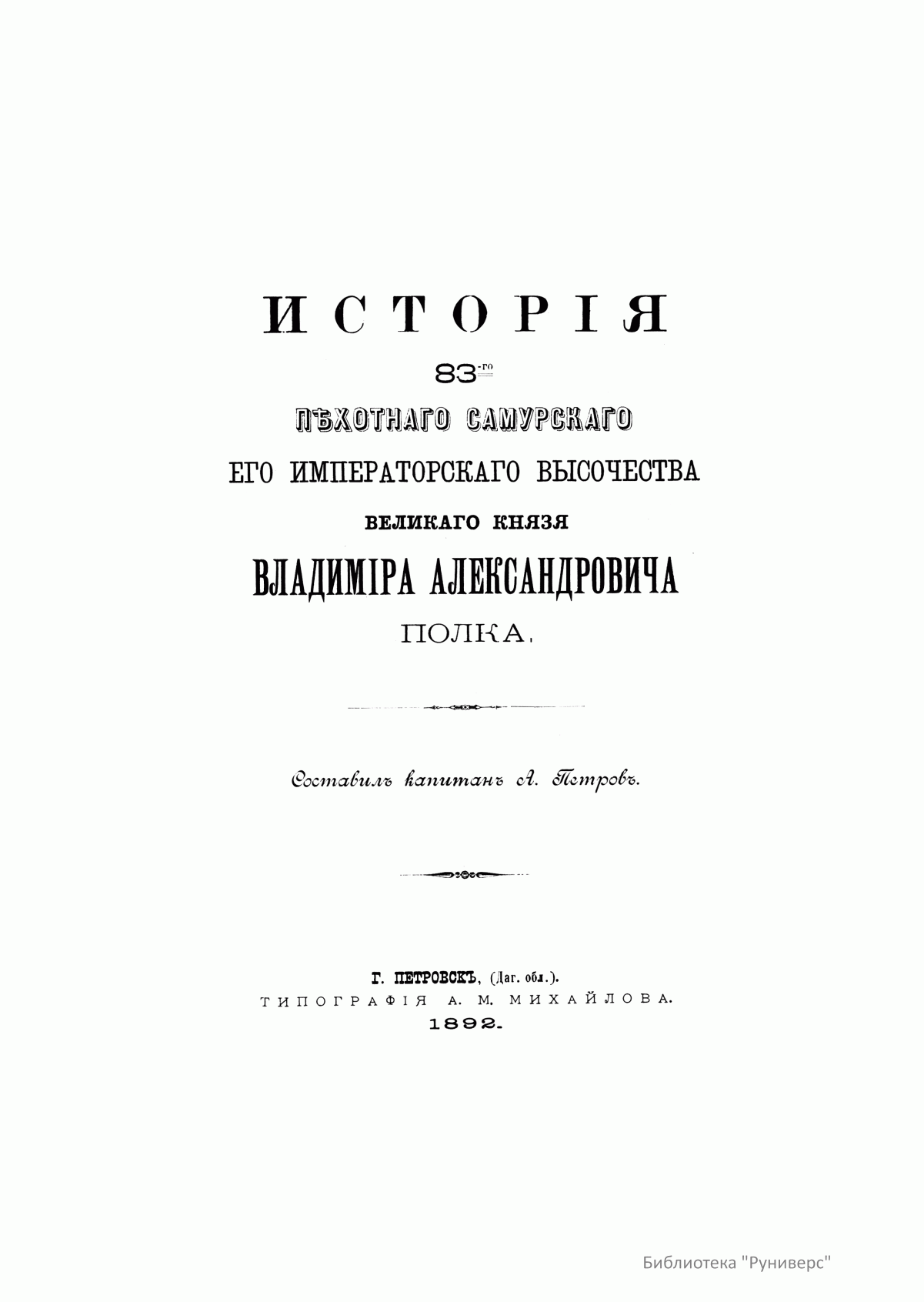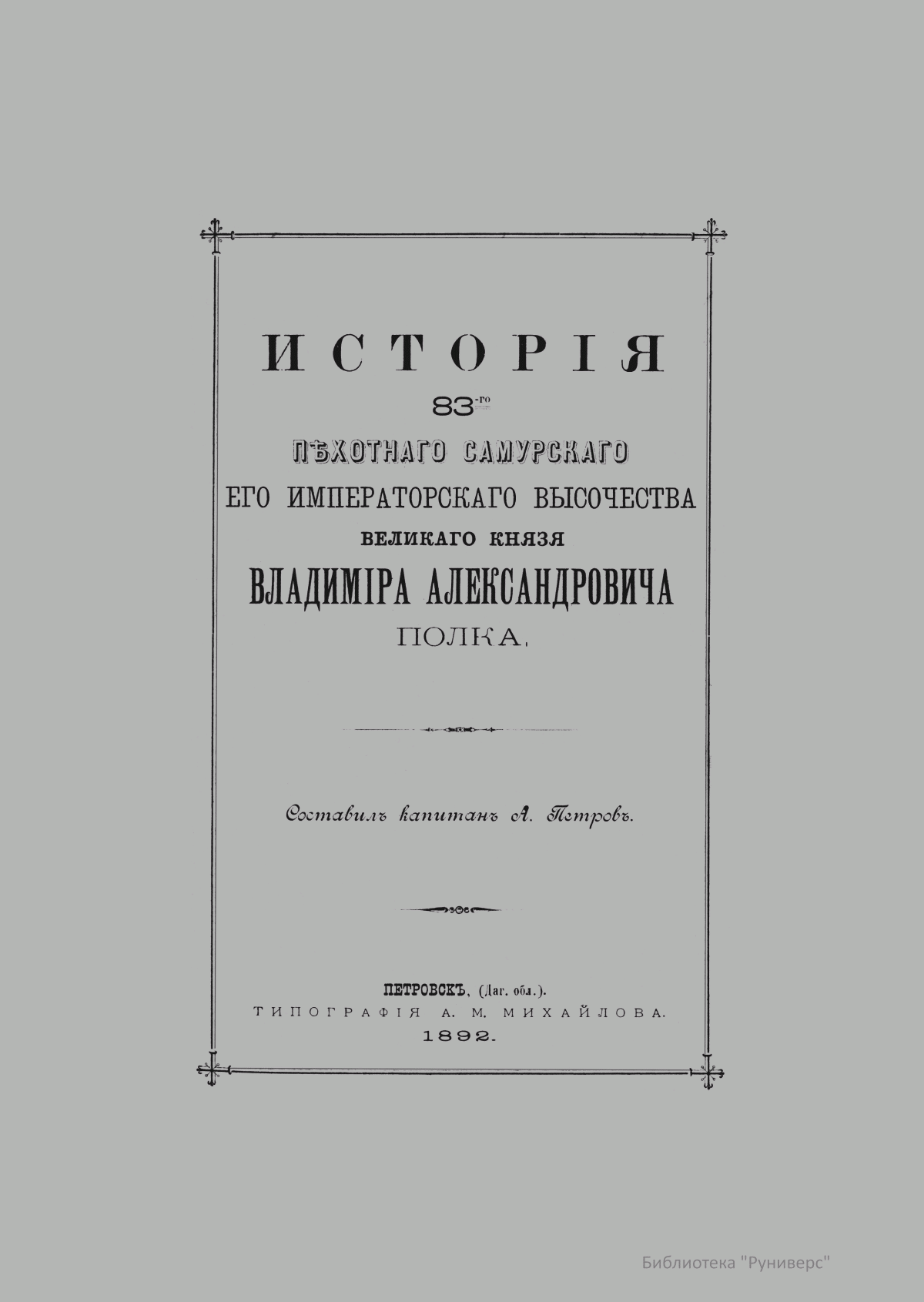 Исторiя 83-го пѣхотнаго Самурскаго Его Императорскаго Высочества Великаго Князя Владимiра Александровича полка