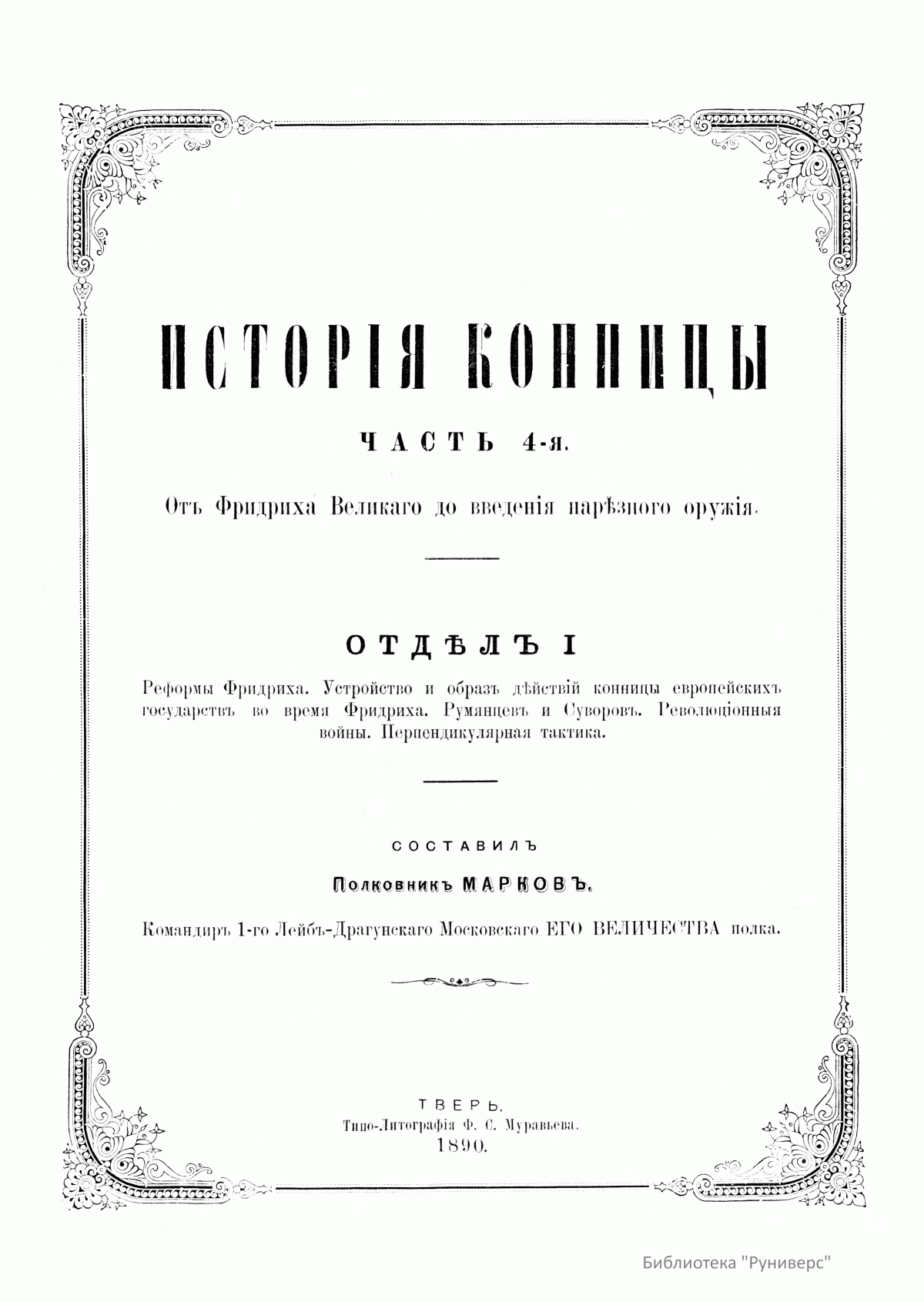Труд по истории конницы М. И. Маркова, командира 1-го лейб-драгунского Московского его величества полка, изданный в конце XIX века в пяти томах, сегодня признан безусловной библиографической редкостью. Капитальная монография, уникальная по объему собранного материала, написана занимательным, живым языком. Издание охватывает обширный и разнообразный по своему составу материал. Изучение конницы ведется со времен ее возникновения в Древней Греции; затем рассмотрено дальнейшее развитие конных войск в Римской империи, в средневековых государствах Европы и Азии. Особенно пристальное внимание автор уделил кавалерии России от ее возникновения до детального разбора действий русской конницы во время Балканской войны 1877–1878 гг. На страницах монографии рассмотрено огромное количество сражений и битв различных государств и эпох, приведены выводы автора об устройстве конницы минувших столетий. Текст сопровождают многочисленные иллюстрации, изображающие породы и окрасы лошадей, формы обмундирования и вооружения всадников, портреты знаменитых полководцев и государственных деятелей, а также схемы и карты сражений.