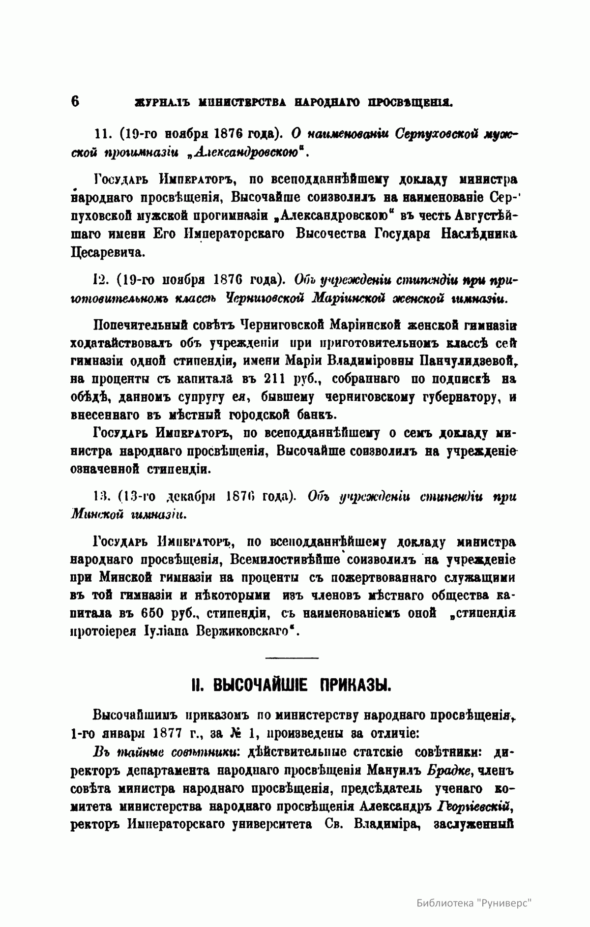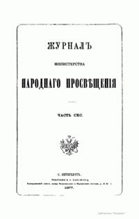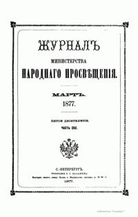 Журнал Министерства народного просвещения выходил с 1834-го по 1917 год. Официальный периодический журнал об успехах просвещения в России. Издатели журнала уверены в том, что «если для каждого человека необходим выход из грубой тьмы невежества и беспрерывное дальнейшее движение к свету, то для народов необходимо попечительное участие правительства в образовании. Только правительство имеет все средства знать и высоту успехов всемирного образования, и настоящие нужды Отечества».