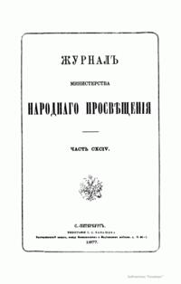 Журнал Министерства народного просвещения выходил с 1834-го по 1917 год. Официальный периодический журнал об успехах просвещения в России. Издатели журнала уверены в том, что «если для каждого человека необходим выход из грубой тьмы невежества и беспрерывное дальнейшее движение к свету, то для народов необходимо попечительное участие правительства в образовании. Только правительство имеет все средства знать и высоту успехов всемирного образования, и настоящие нужды Отечества».