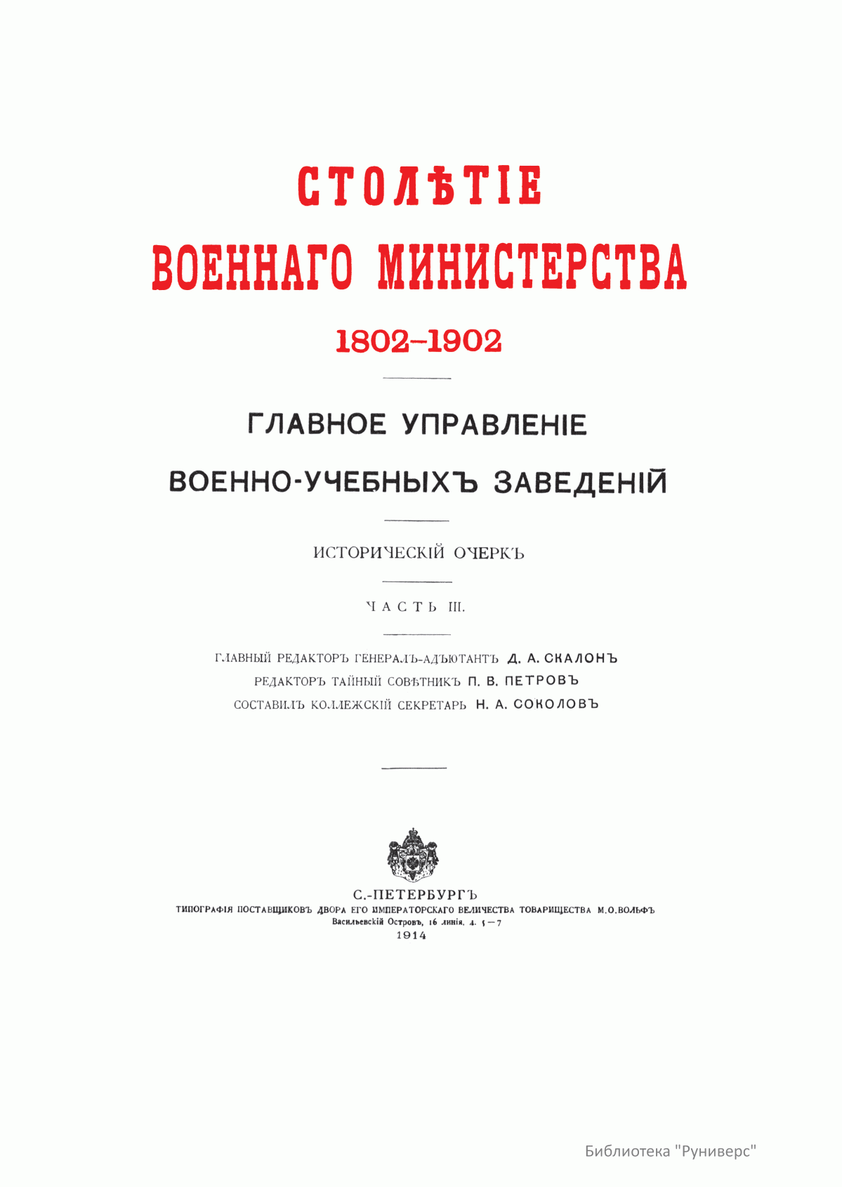 Столѣтiе военнаго министерства. 1802-1902. Главное управленiе военно-учебныхъ заведенiй. Историческiй очеркъ. Книга 2