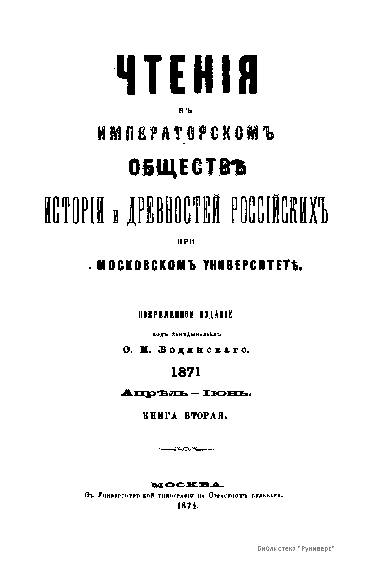 Чтенiя въ Императорскомъ Обществѣ Исторiи и Древностей Россiйскихъ при Московскомъ Университетѣ. 1871. Апрѣль-Iюнь. Книга вторая