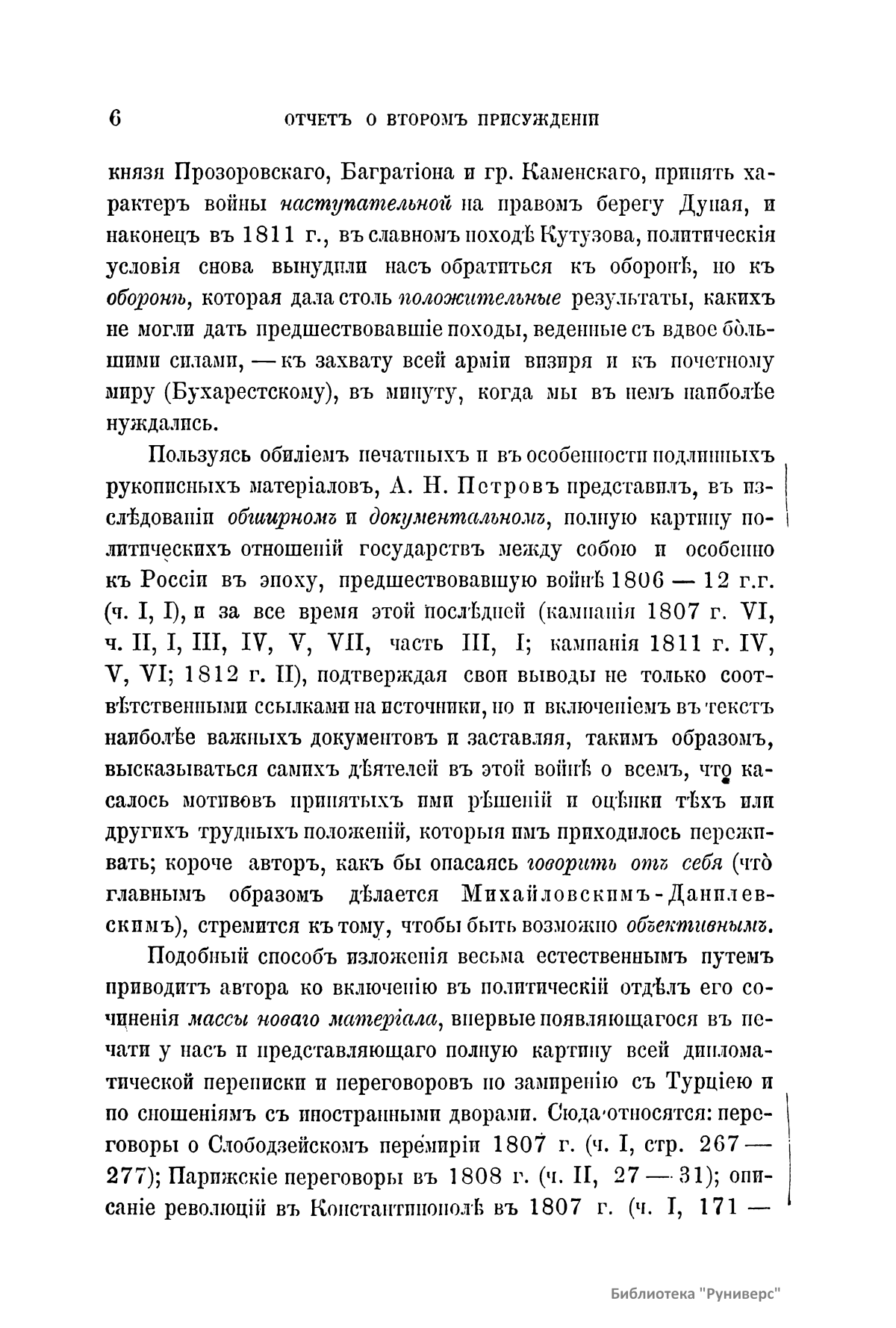 Настоящая публикация – обстоятельная рецензия генерал-лейтенанта Г. А. Леера на фундаментальное сочинение А. Н. Петрова «Война России с Турцией с 1806 по 1812 г.» (1885 – 1887) в сопоставлении с трудом А. И. Михайловского-Данилевского «Описание русско-турецкой войны 1806 – 1812 гг.» (1843). Рецензент считает, что данное сочинение является весьма ценным вкладом в литературу русско-турецких войн, исследованию которых автор посвятил 27-летний в высшей степени добросовестный труд, и просит удостоить его одной из премий митрополита Макария. Русско-турецкая война 1806 – 1812 гг. начата Турцией с целью возврата бывших владений в Северном Причерноморье и на Кавказе. Победы русских войск и дипломатическое искусство М. И. Кутузова привели к Бухарестскому миру 1812 г.