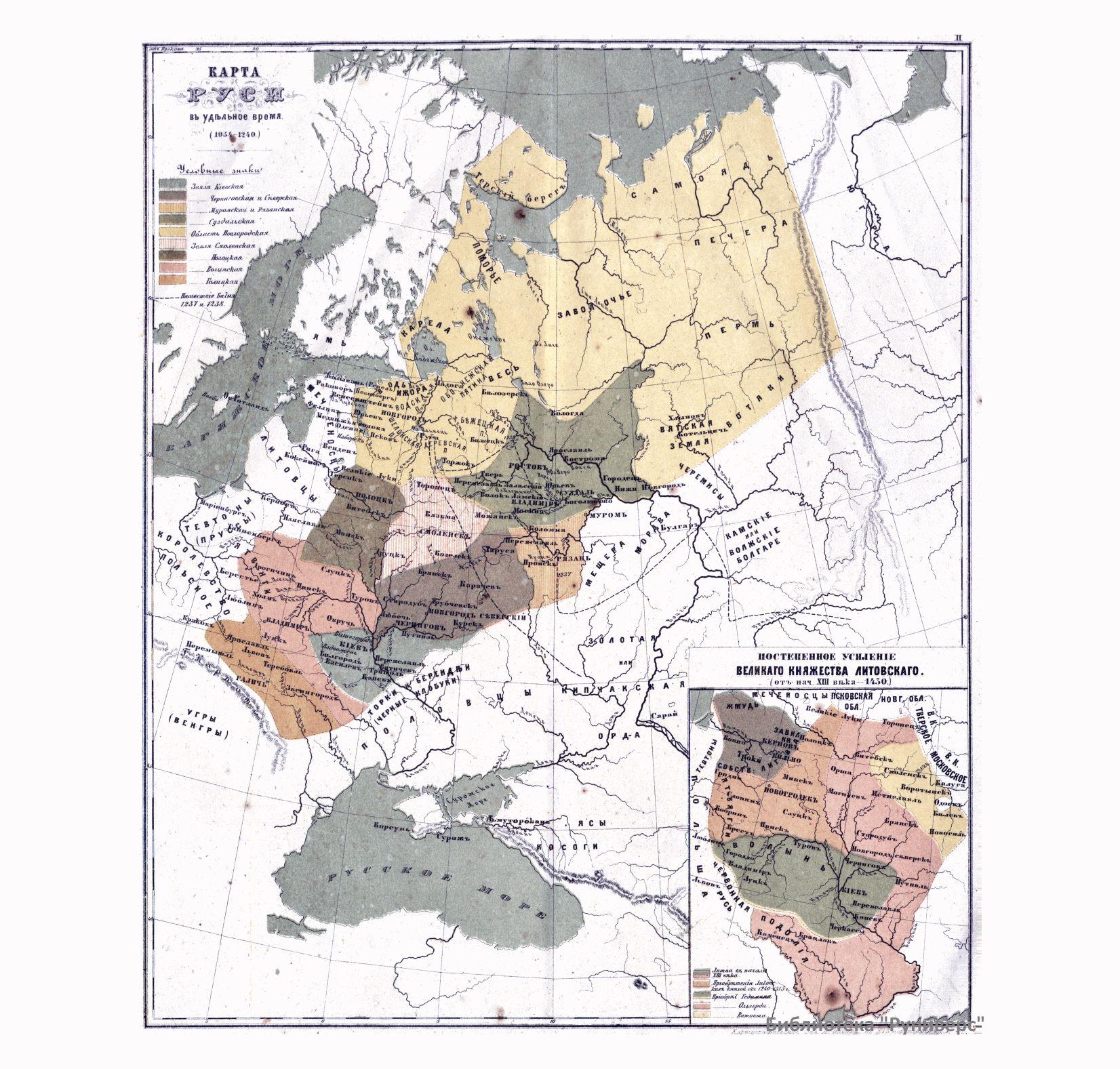 «Учебный Атлас по Русской Истории», Санкт-Петербург. 1874 г. Издание было осуществлено Картографическим заведением А. Ильина. Атлас состоит из 6 хромолитографированных карт-реконструкций, двух планов городов (Древнего Новгорода и Москвы XVII в.); двух таблиц — «Родословной» и «Хронологической».