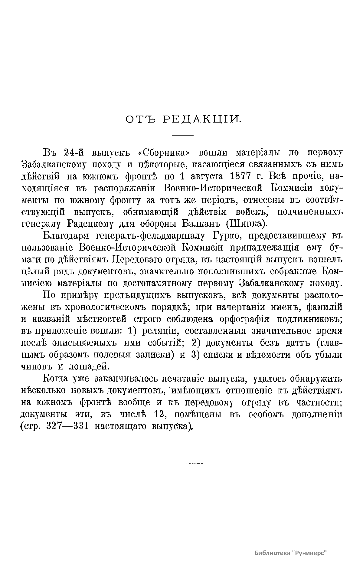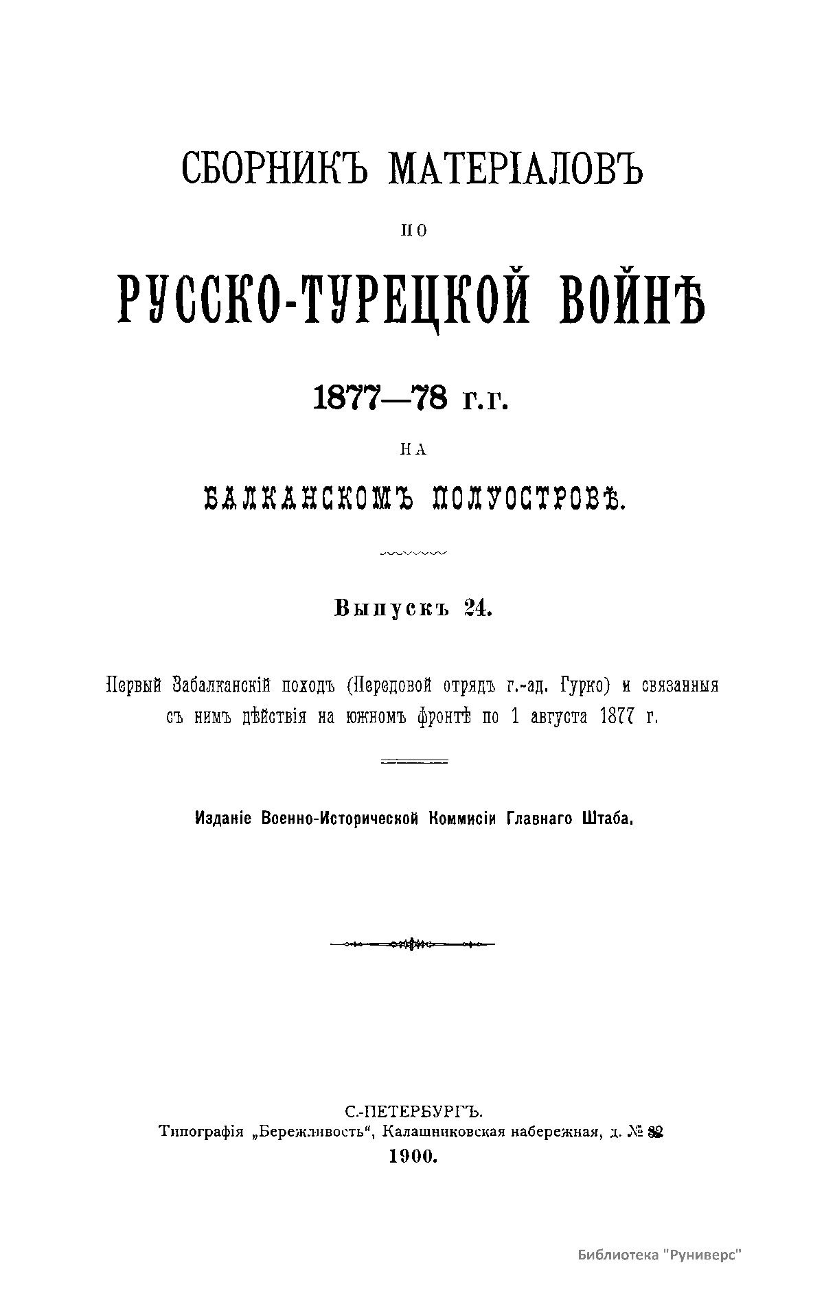 Сборникъ матерiаловъ по русско-турецкой войнѣ 1877-1878 г.г. на Балканскомъ полуостровѣ. Выпускъ 24. Первый Забалканскiй походъ (Передовой отрядъ г.-ад. Гурко) и связанныя съ нимъ дѣйствiя на южномъ фронтѣ по 1 августа 1877 г.