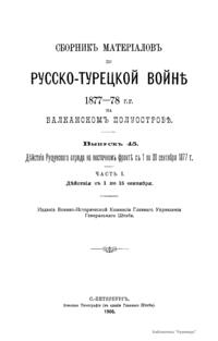 Сборникъ матерiаловъ по русско-турецкой войнѣ 1877-1878 г.г. на Балканскомъ полуостровѣ. Выпускъ 45. Дѣйствiя Рущукскаго отряда на восточномъ фронтѣ съ 1 по 30 сентября 1877 г. Часть I. Дѣйствия съ 1 по 15 сентября