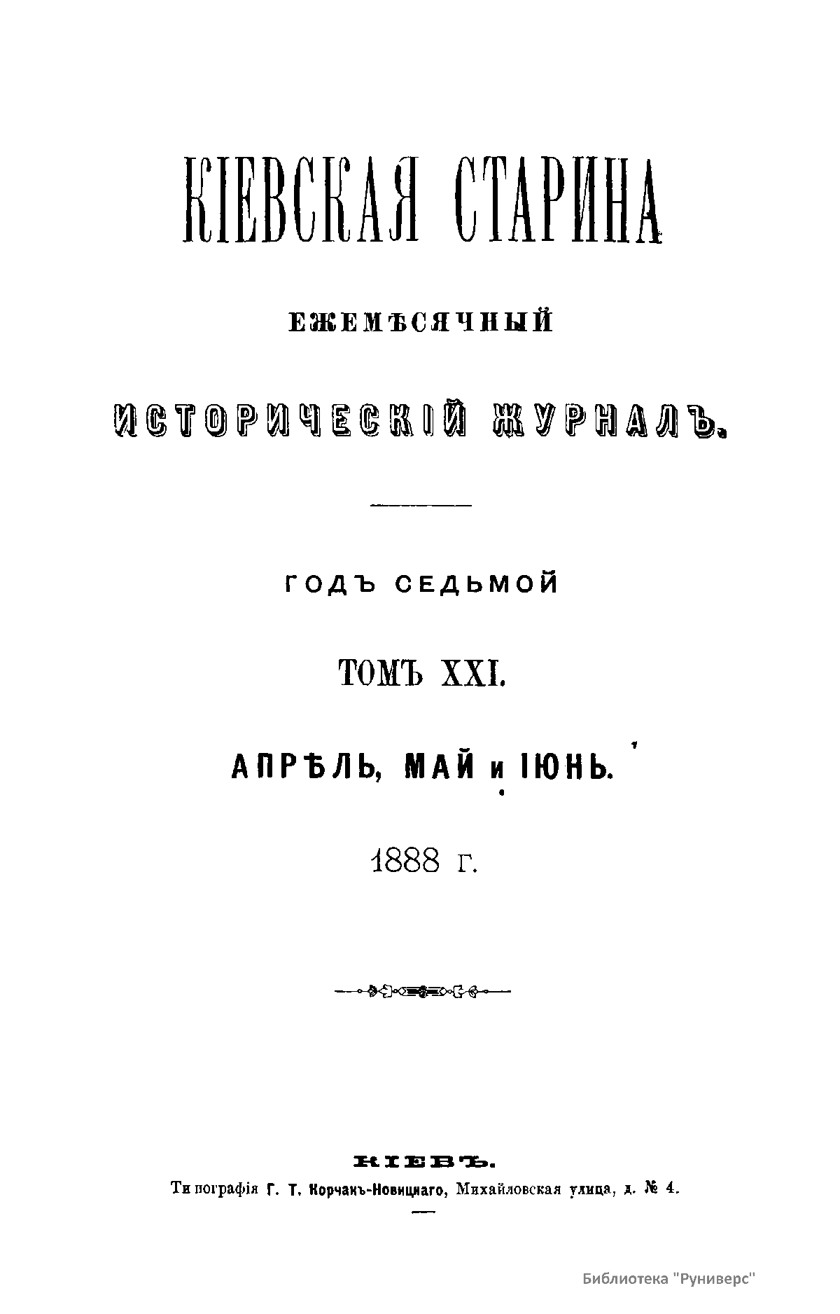 Кiевская старина. Годъ седьмой. Томъ XXI. Апрѣль-Iюнь 1888 г.